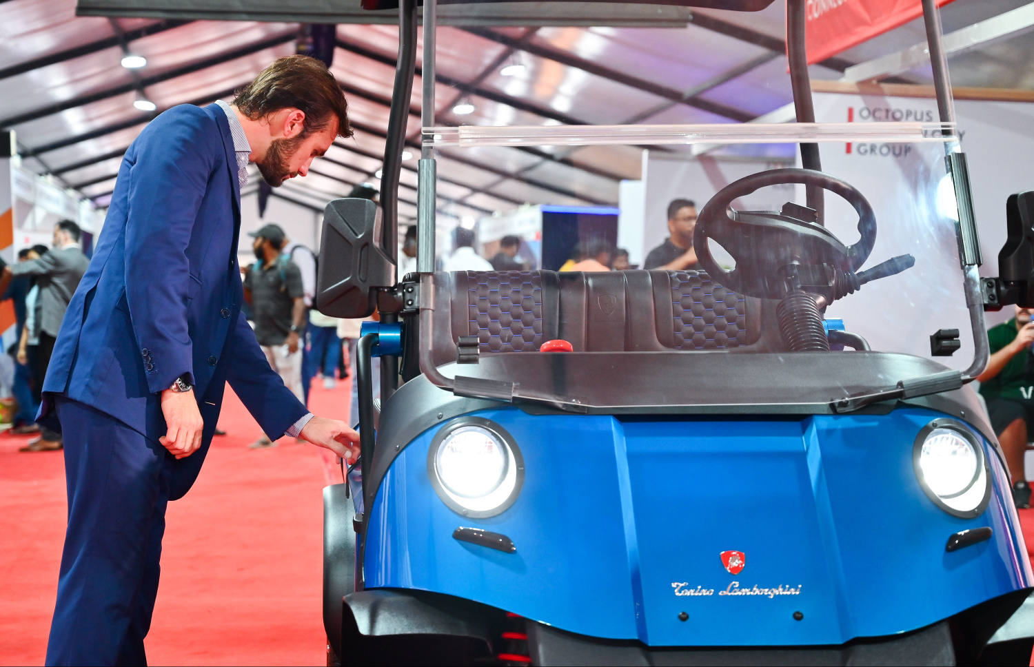 Vice President of Lamborghini Ferruccio Lamborghini inspecting the golf carts at the TechEng 2025 Exhibition -- Photo: Fayaz Moosa | Mihaaru