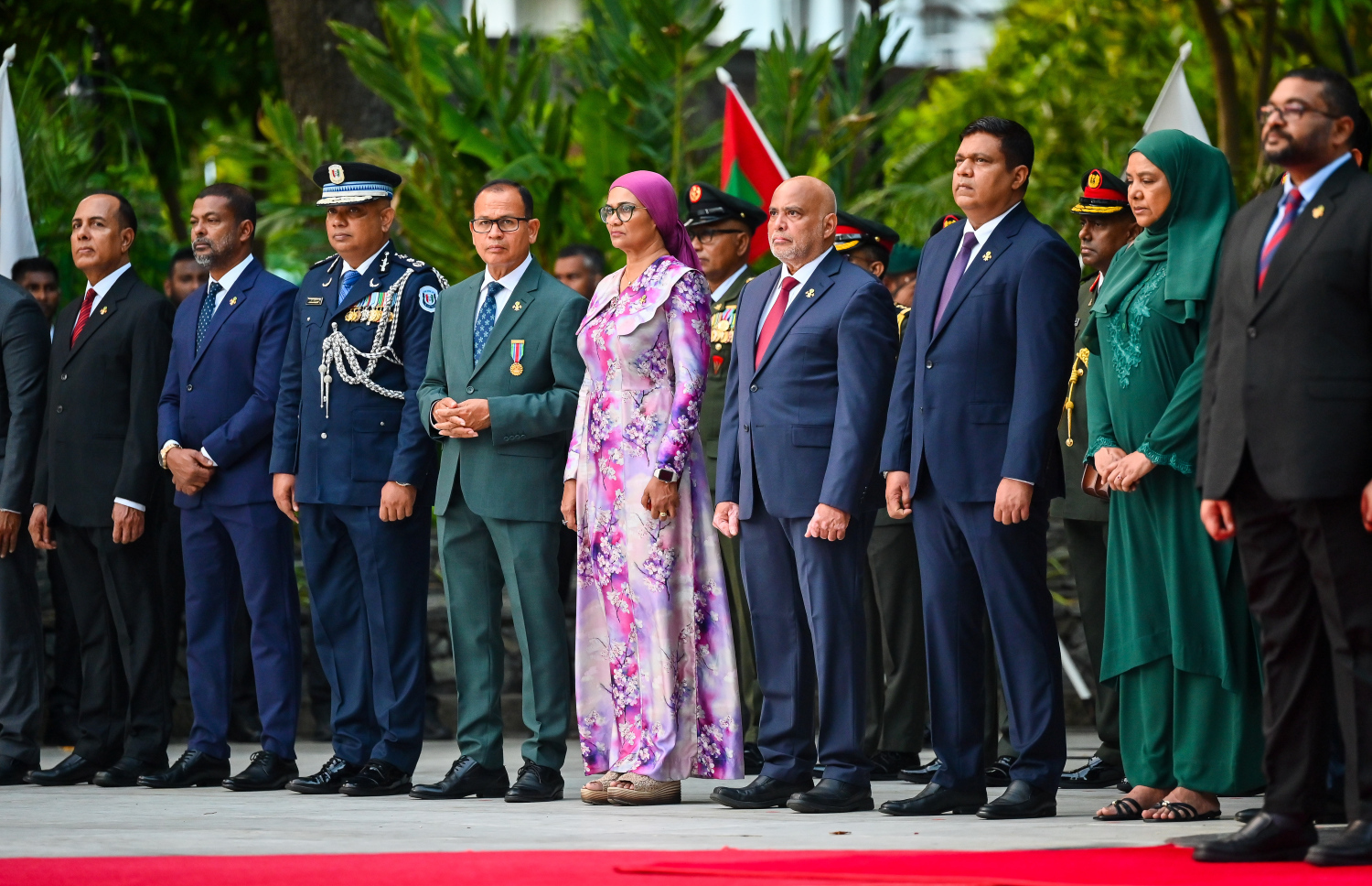 Some ministers attending the flag raising, guard mounting ceremony at the Victory Monument for Victory Day -- Photo: Fayaz Moosa | Mihaaru