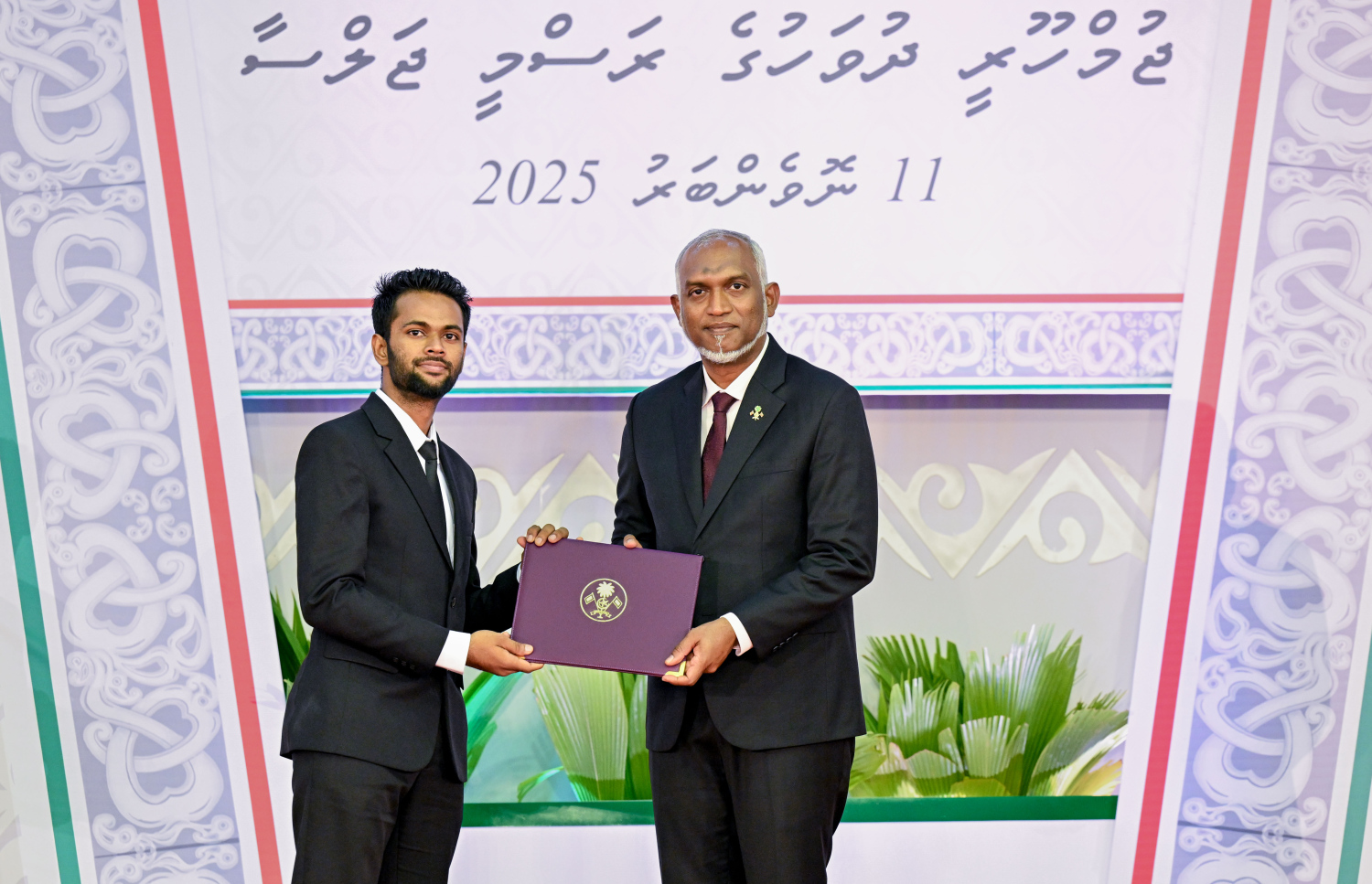 President Dr. Muizzu presenting a certificate to a young person who achieved a high academic ranking. --- Photo: President's Office