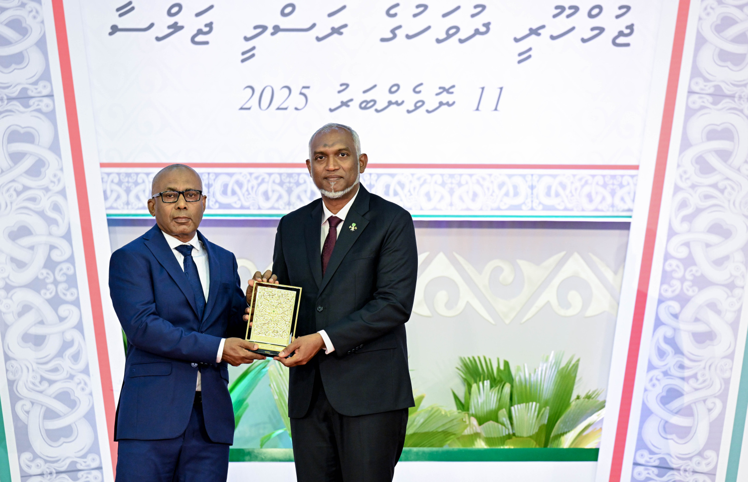 President Muizzu presenting the Shield of Honor to an individual recognized with the Award for Distinguished Service to the Maldivian State.
