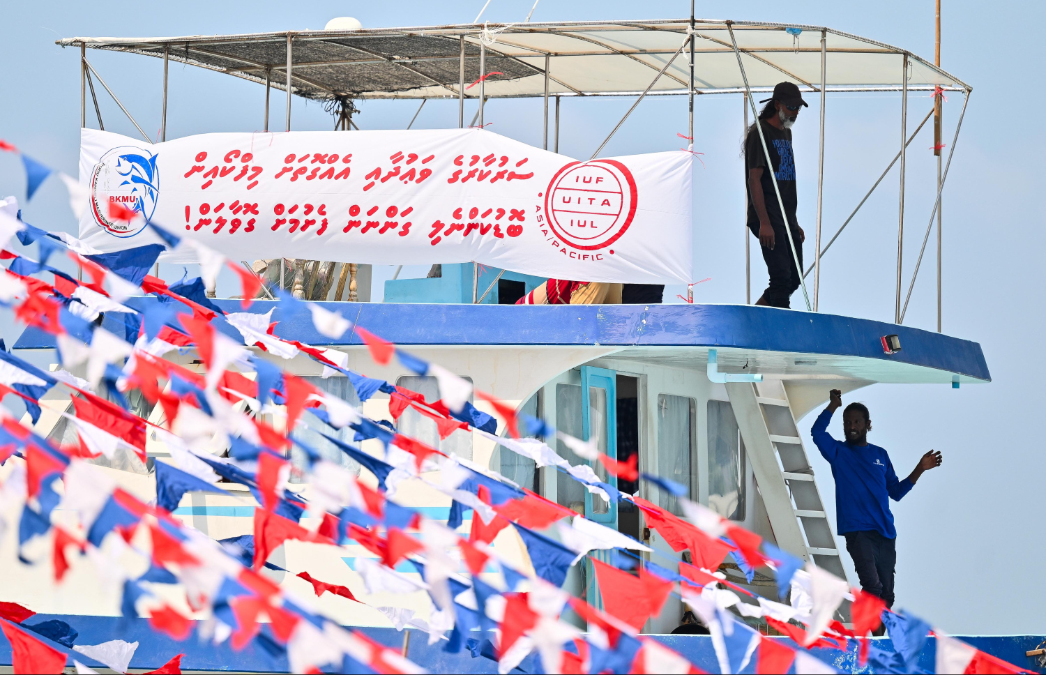 Banners being affixed onto marine vessels for the fishermen's protest under the slogan "Will not sail, not again" -- Photo: Fayaz Moosa | Mihaaru