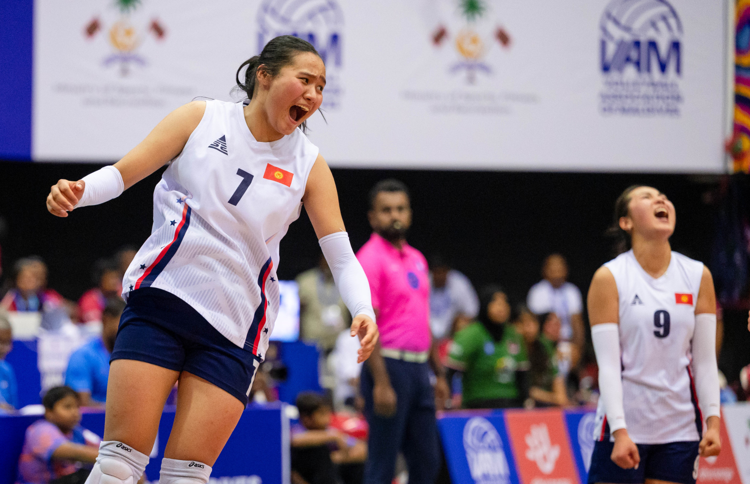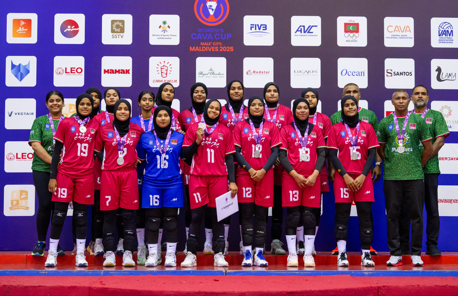 The Kyrgyzstan National Women's Volleyball team after having won the 2025 CAVA Cup against Maldives 3-1 -- Photo: Fayaz Moosa | Mihaaru