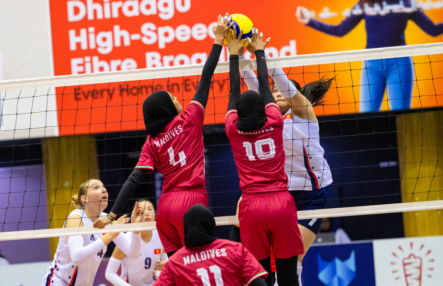 Maldivian players working to block a ball from Kyrgyzstan during the CAVA Cup final -- Photo: Fayaz Moosa | Mihaaru