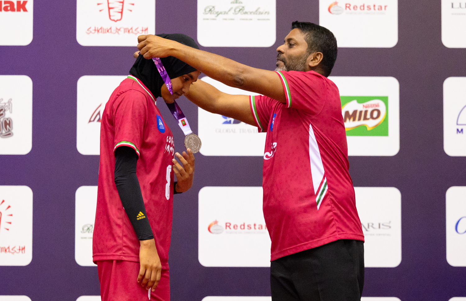 Sports Minister Abdulla Rafiu awarding a medal to a player from CAVA Cup's second place holder, Maldives -- Photo: Fayaz Moosa | Mihaaru
