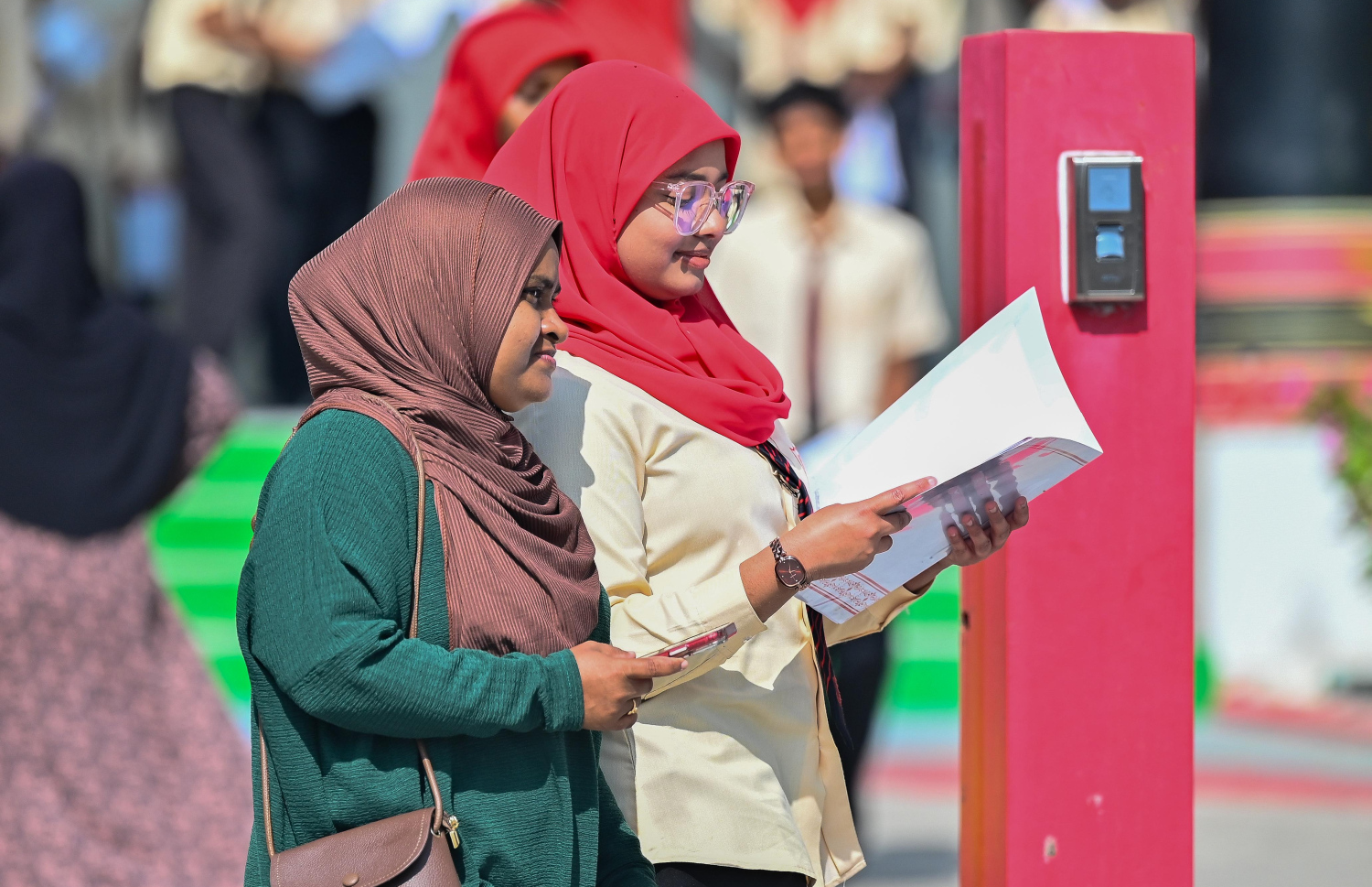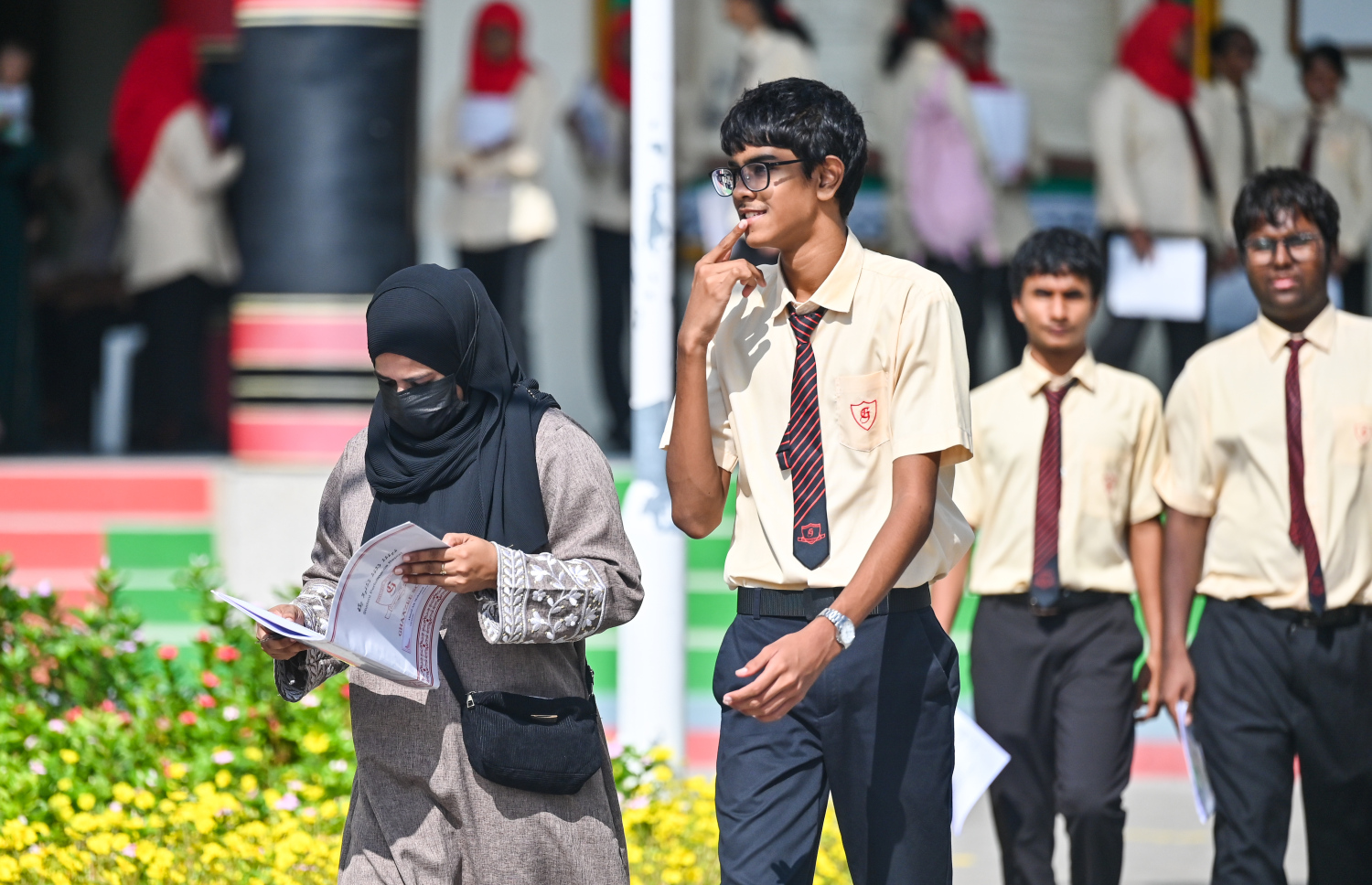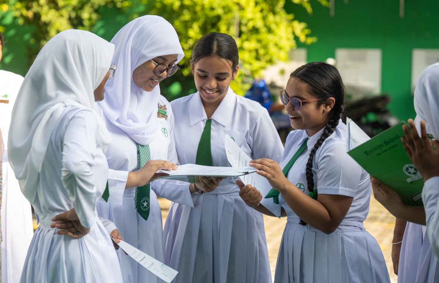 Ameeniyya School students looking at their report forms: School will be back in session on 27th January 2026 -- Photo: Nishan Ali | Mihaaru