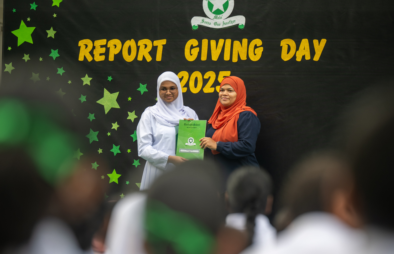 A head of Ameeniyya School handing over a report form to a student -- Photo: Nishan Ali | Mihaaru