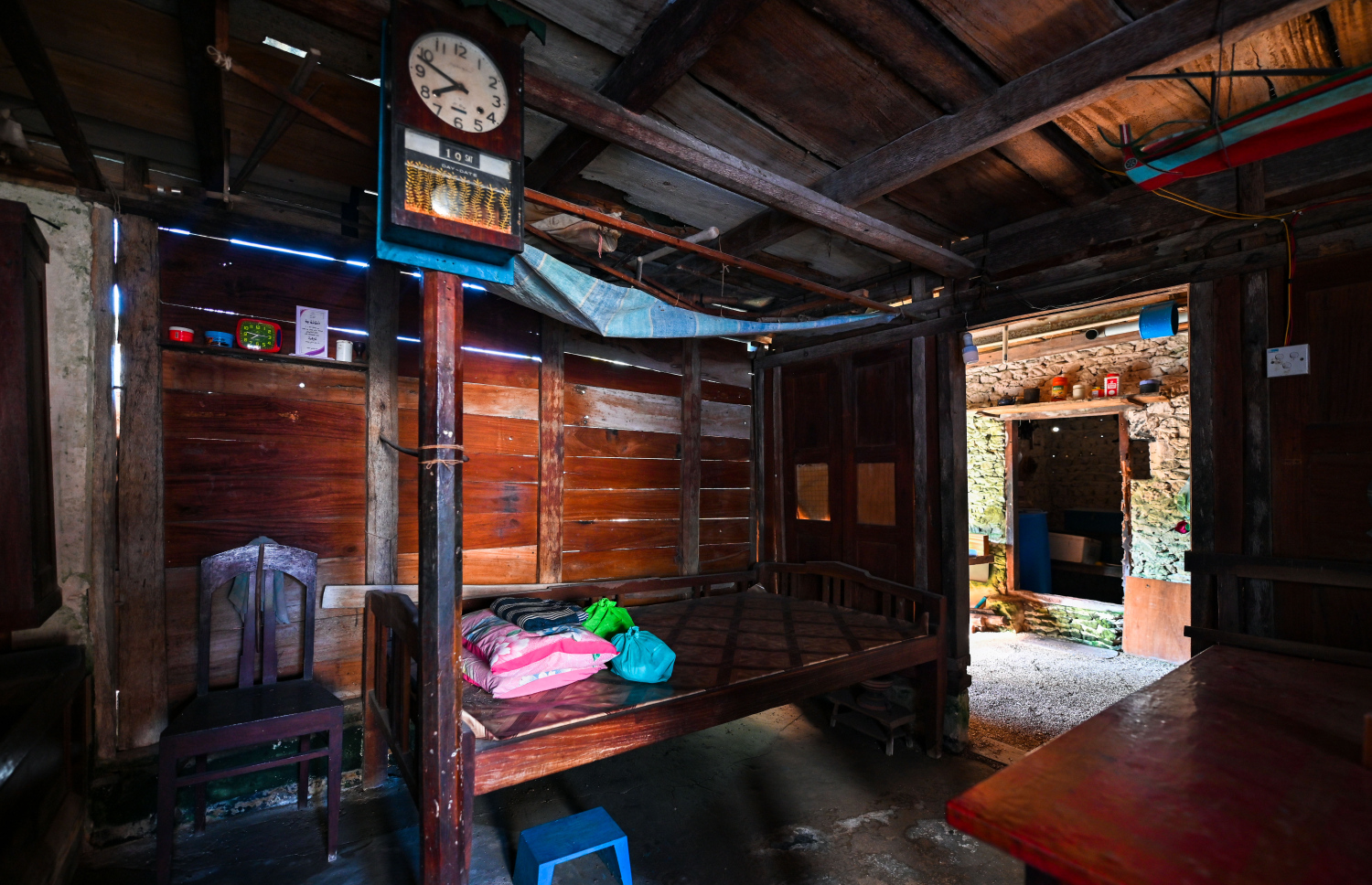 The wooden bed Alibe usually uses to sit and work: The house is more than a century old -- Photo: Fayaz Moosa | Mihaaru