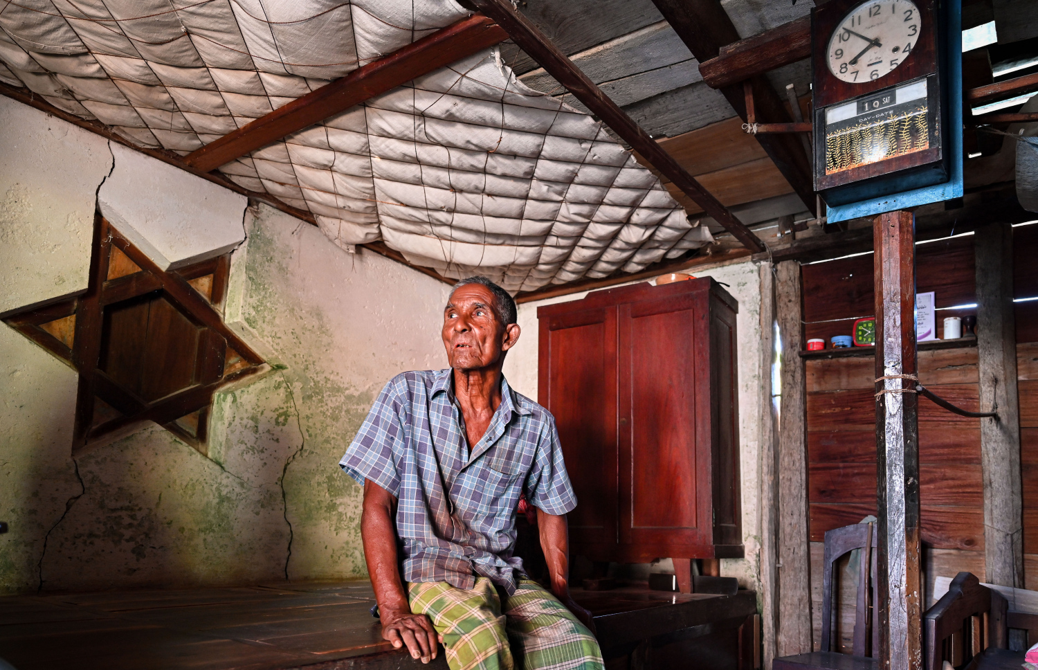 Alibe sitting on Tharijehige's wooden shelf: He does not want to change the house at all -- Photo: Fayaz Moosa | Mihaaru