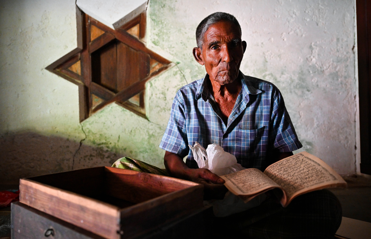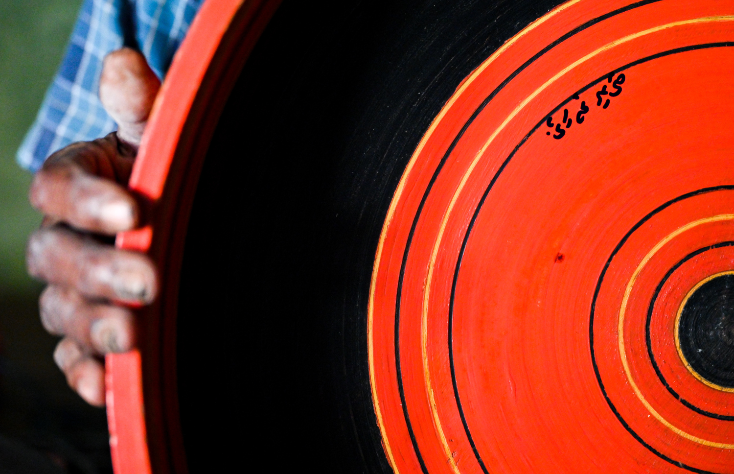 Alibe showing a lacquered container where he and his family used to put Maldivian areca nuts and post-meal snacks into -- Photo: Fayaz Moosa | Mihaaru