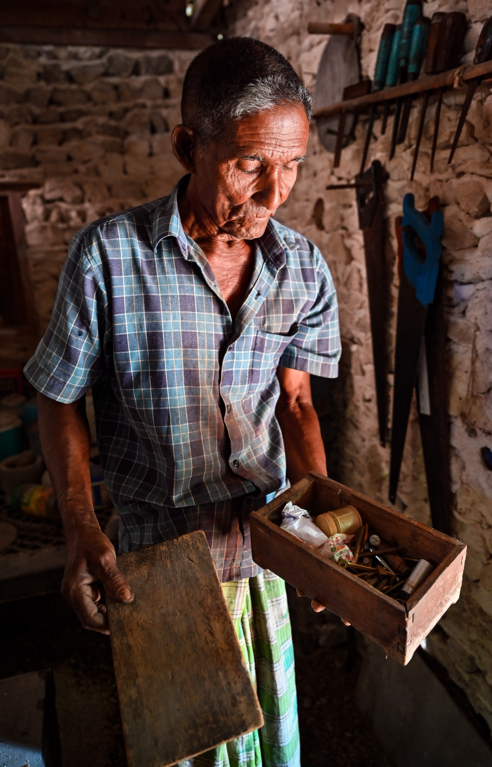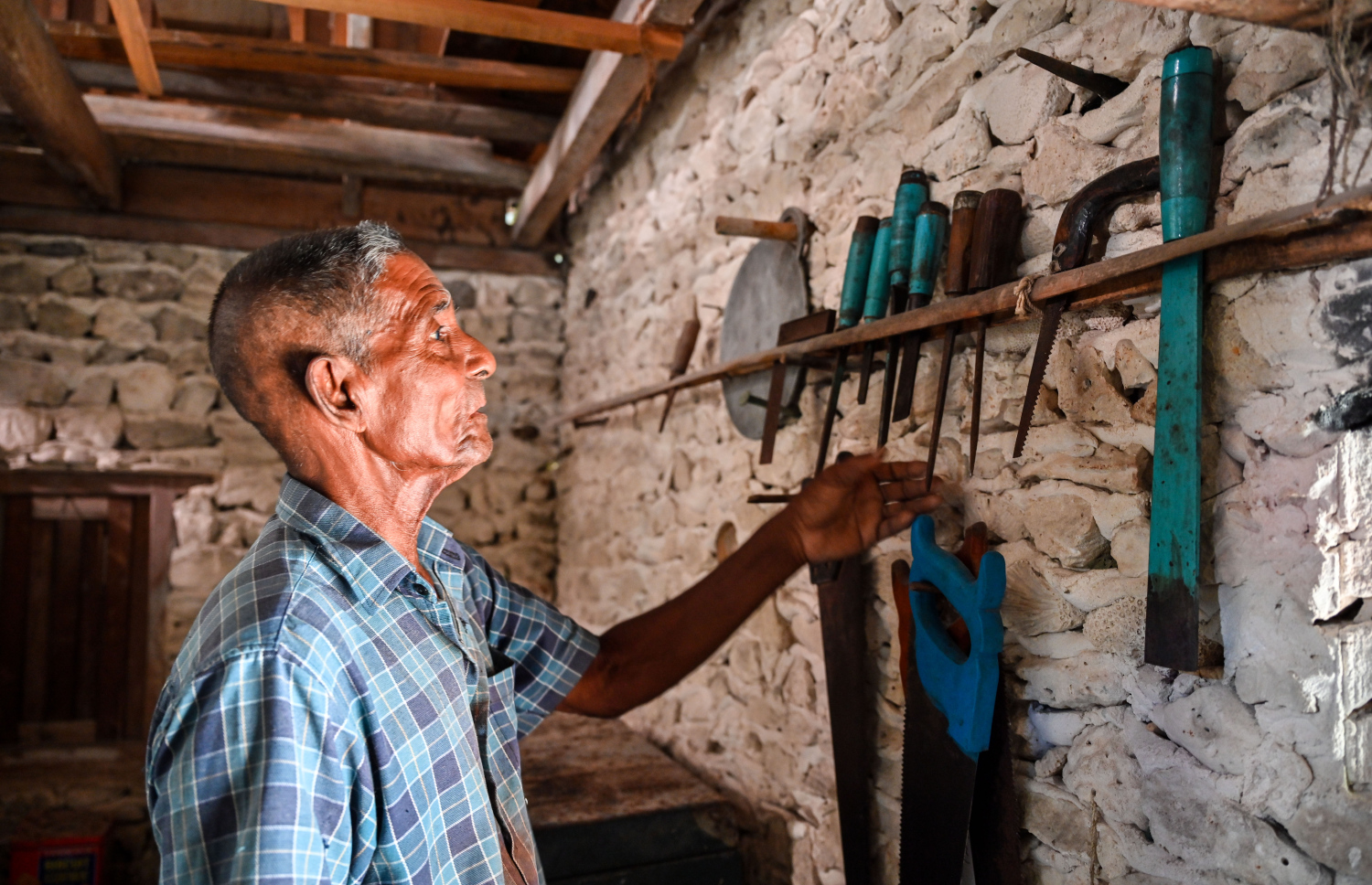 Alibe showing his carpentry tools: He keeps many tools in his house -- Photo: Fayaz Moosa | Mihaaru