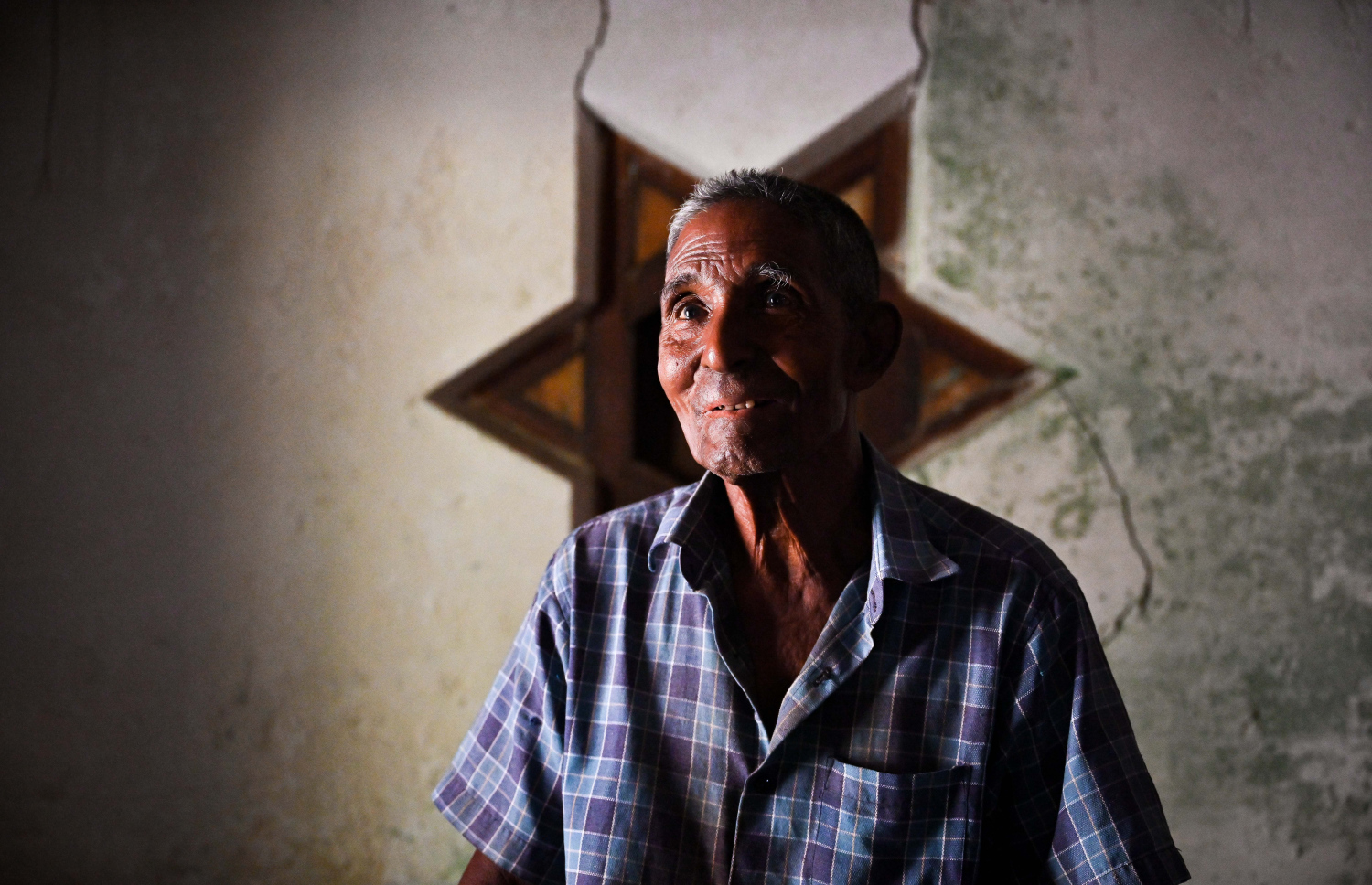 Alibe posing for a picture at Tharijehige's doorframe: Even though he lives alone, he gets to reminisce about his family -- Photo: Fayaz Moosa | Mihaaru