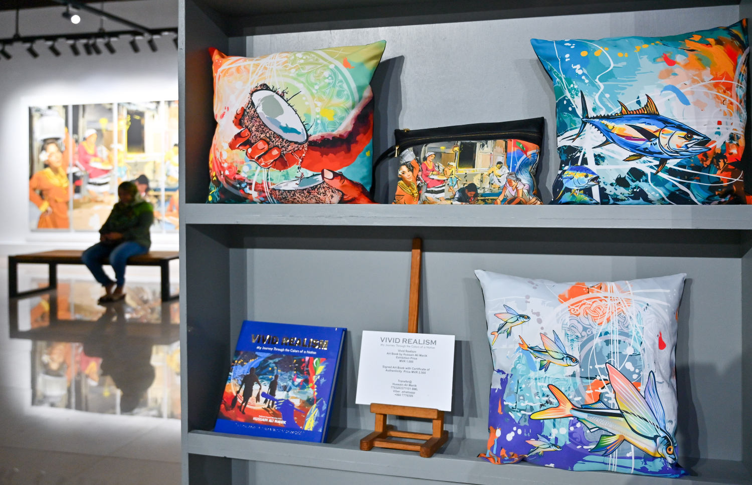 Some items created using his paintings are on display at artist Hussain Ali Manik's "Vivid Realism - By Hussain" art exhibition.--- Photo: Fayaz Moosa | Mihaaru