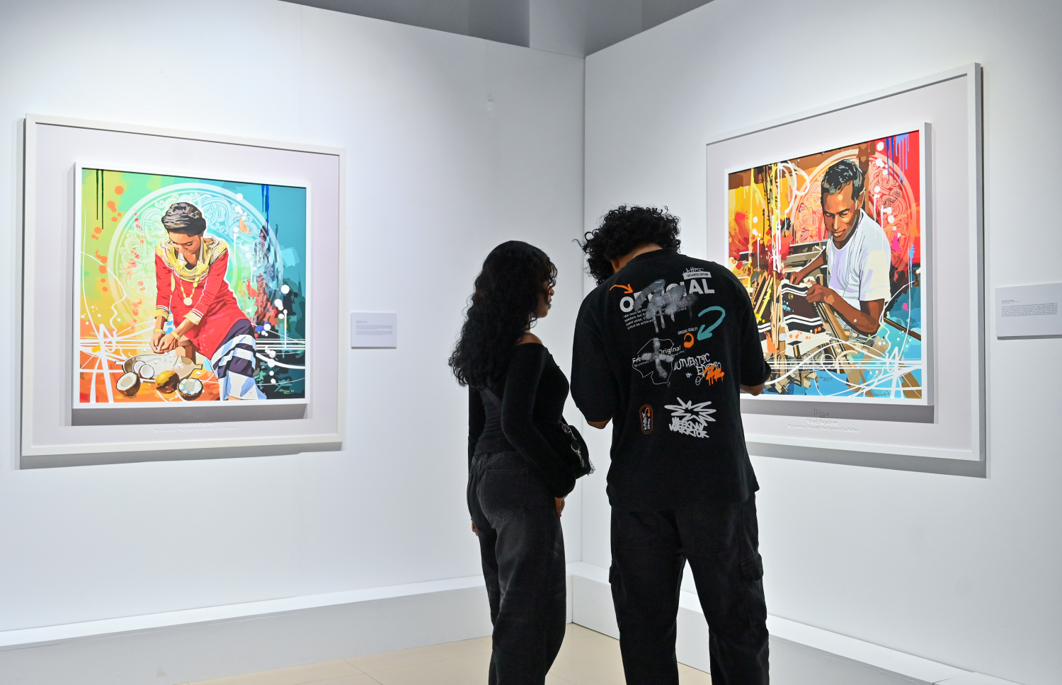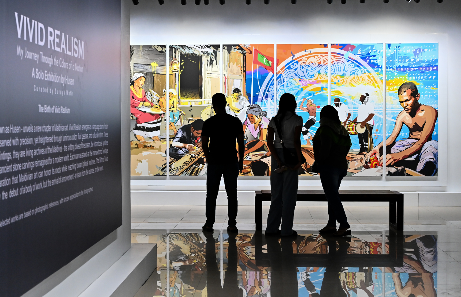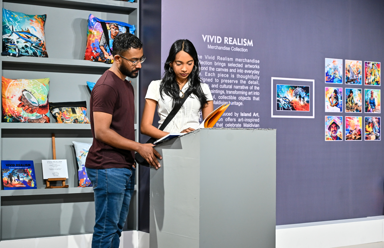Visitors to the "Vivid Realism - By Hussain" art exhibition look through the book "Vivid Realism – My Journey Through the Colors of a Nation."-- Photo: Fayaz Moosa | Mihaaru