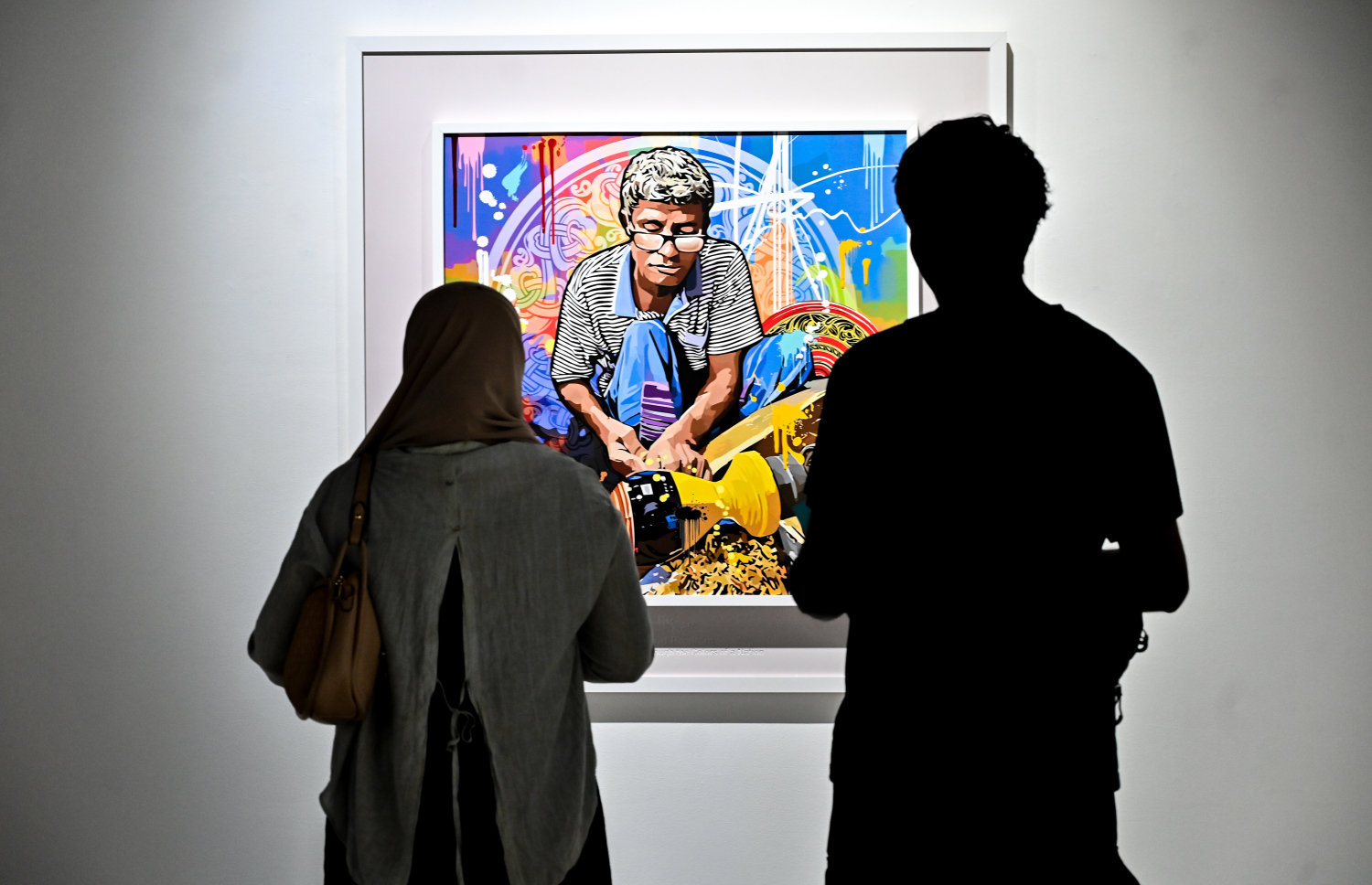 A visitor to the "Vivid Realism - By Hussain" art exhibition takes a photo of a painting by artist Hussain Ali Manik with their phone.-- Photo: Fayaz Moosa | Mihaaru
