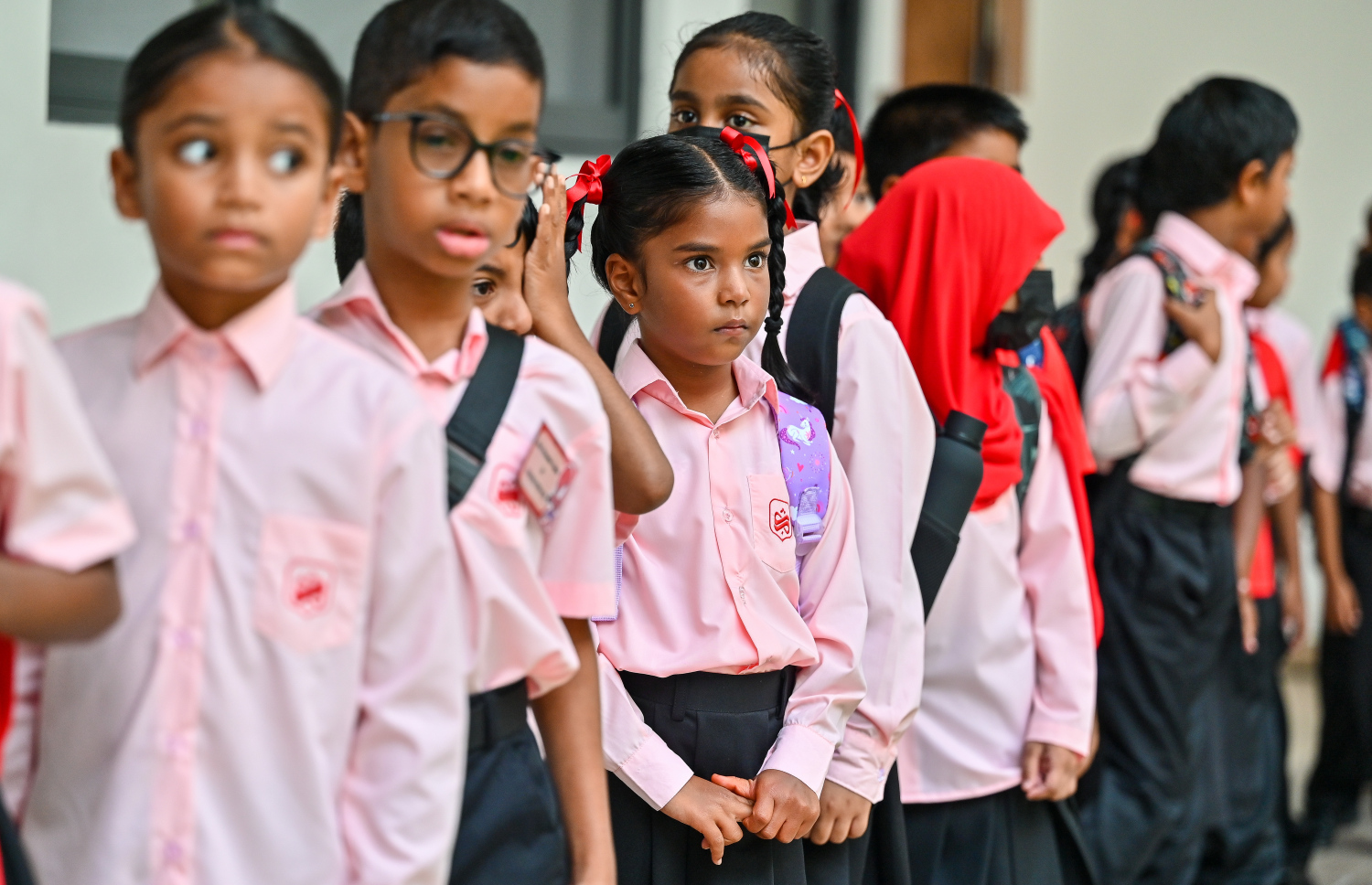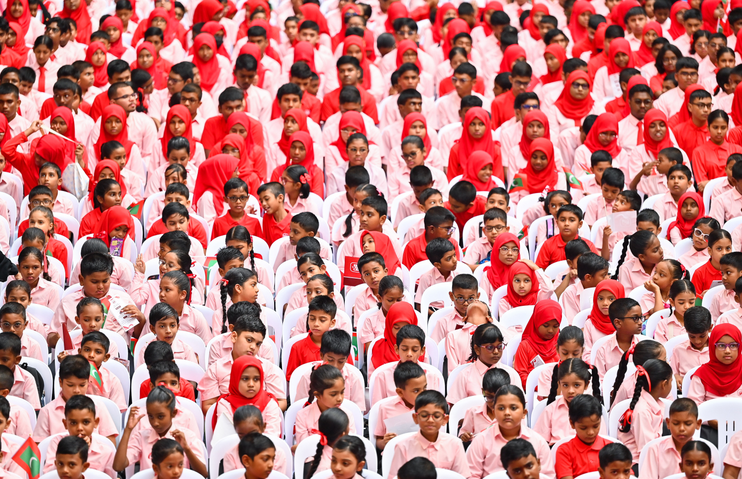 Students at the special assembly for the opening ceremony of the Shaheed Ali School: The most modernized school that has been built in the Male' region by the current government -- Photo: Fayaz Moosa | Mihaaru