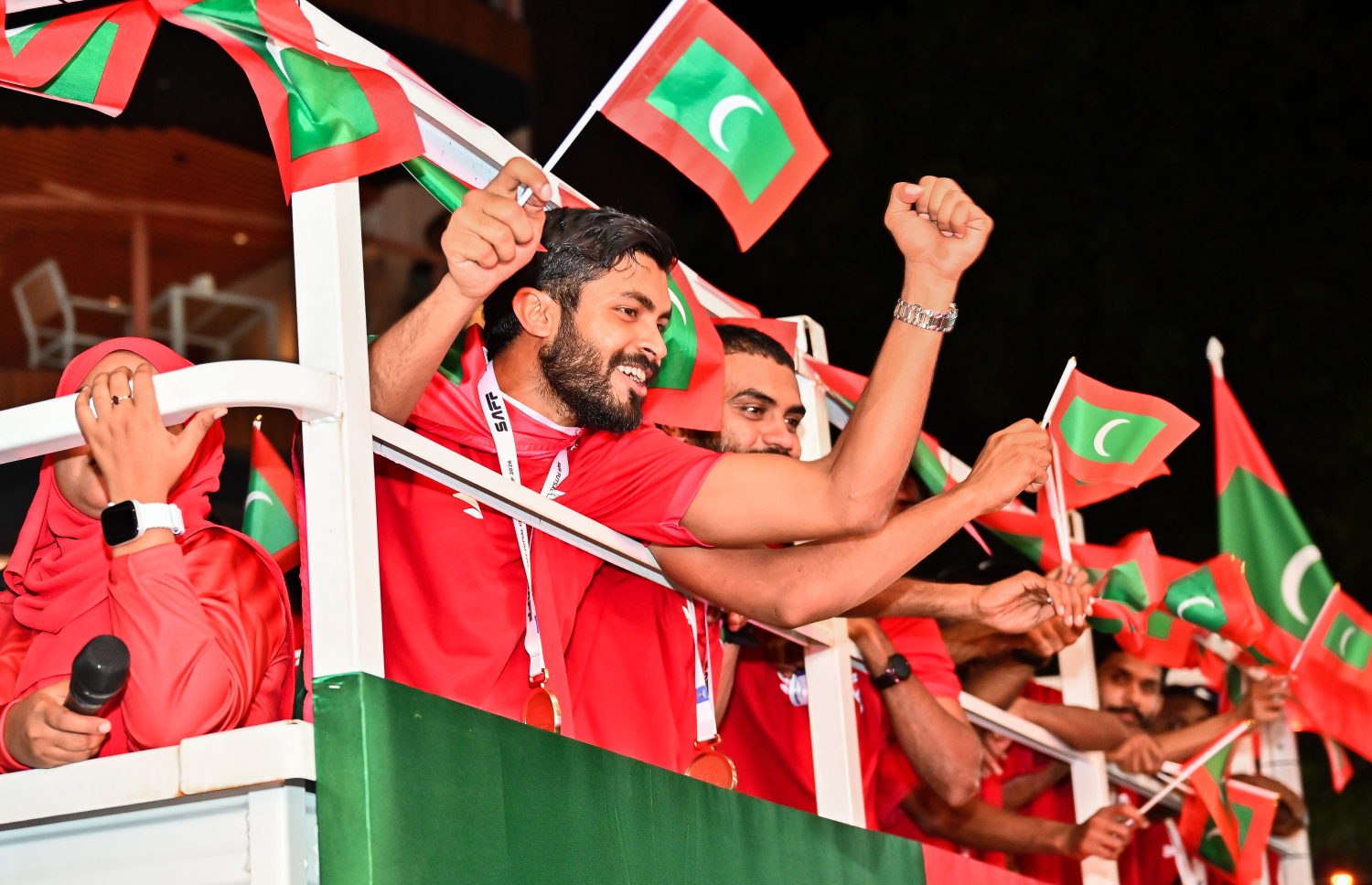 National futsal team at the celebration event after winning all their matches at the AFC Futsal Asian Cup with people watching the fireworks upon their return -- Photo: Fayaz Moosa | Mihaaru