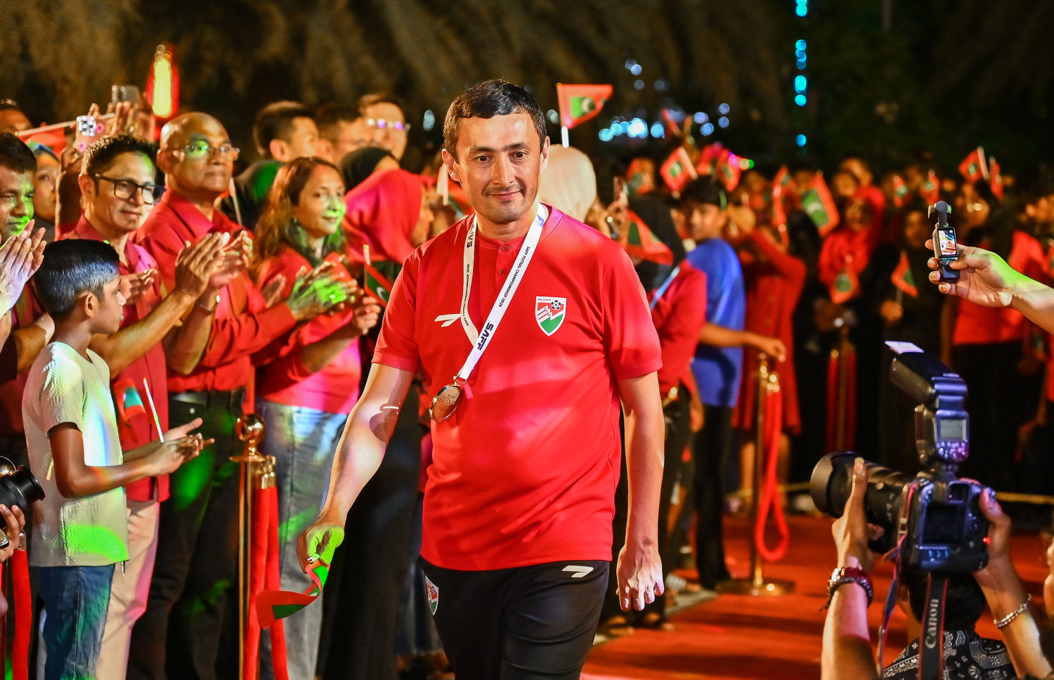 Supporters congratulating national futsal team coach Farrukh Zakirov -- Photo: Fayaz Moosa | Mihaaru