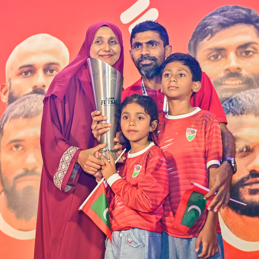 National futsal team at the celebration event after winning all their matches at the AFC Futsal Asian Cup with fireworks upon their return, with a team player posing with their family with the cup -- Photo: Fayaz Moosa | Mihaaru