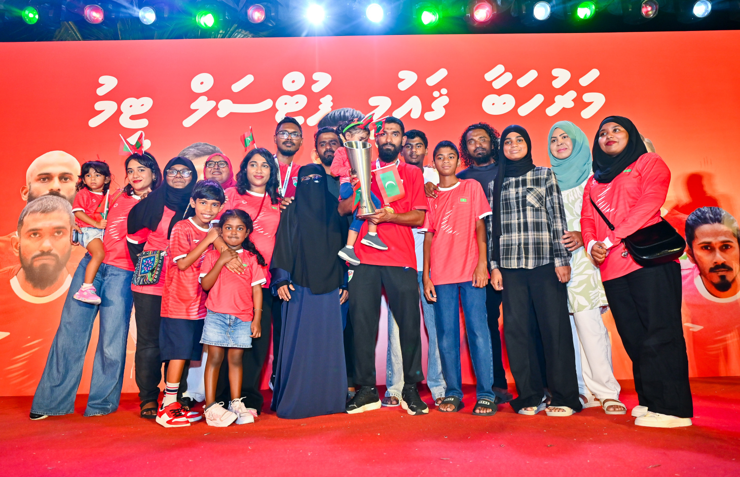 National futsal team at the celebration event after winning all their matches at the AFC Futsal Asian Cup with fireworks upon their return, with people posing with their family with the cup -- Photo: Fayaz Moosa | Mihaaru