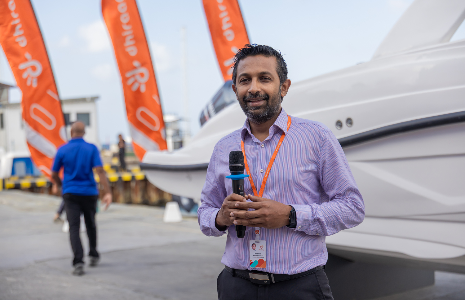 Handover ceremony to the first winner of Dhiraagu's "Enroll and Win 2 Speedboats" promotion: Director, Brand and Marketing Communication Mirshan Adam speaking -- Photo: Dhiraagu