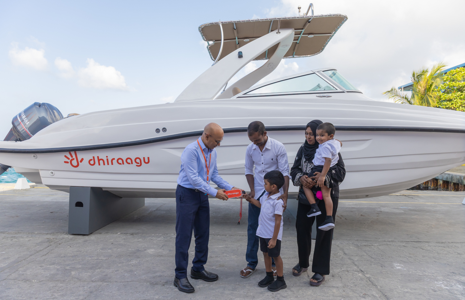 Handover ceremony to the first winner of Dhiraagu's "Enroll and Win 2 Speedboats" promotion: Winners will receive an Al Shali Marine Canary 28 sports speedboat -- Photo: Dhiraagu