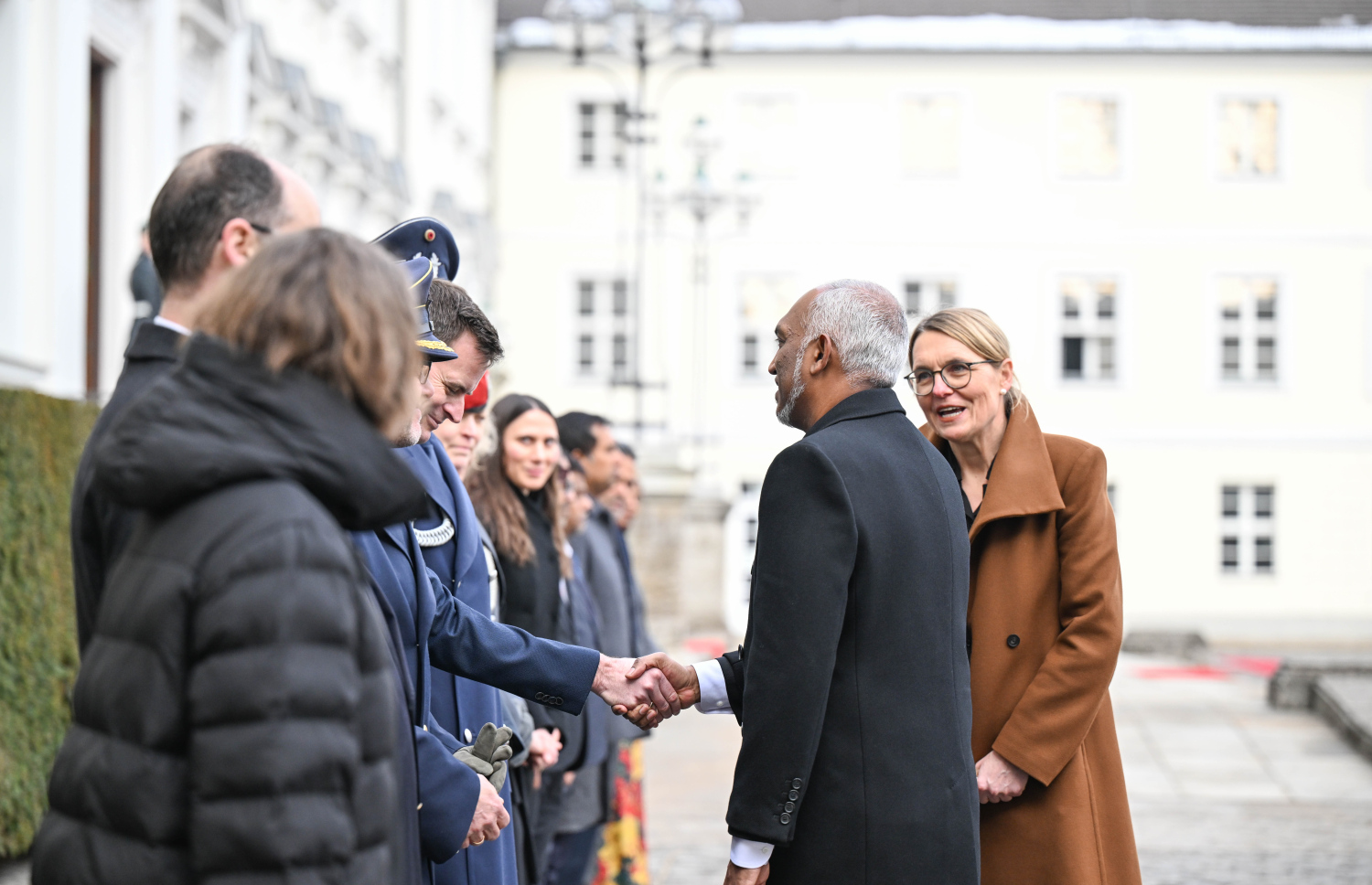 President Mohamed Muizzu shakes hands with senior officials of the country during the official welcoming ceremony of his visit to Germany --- Photo: President's Office