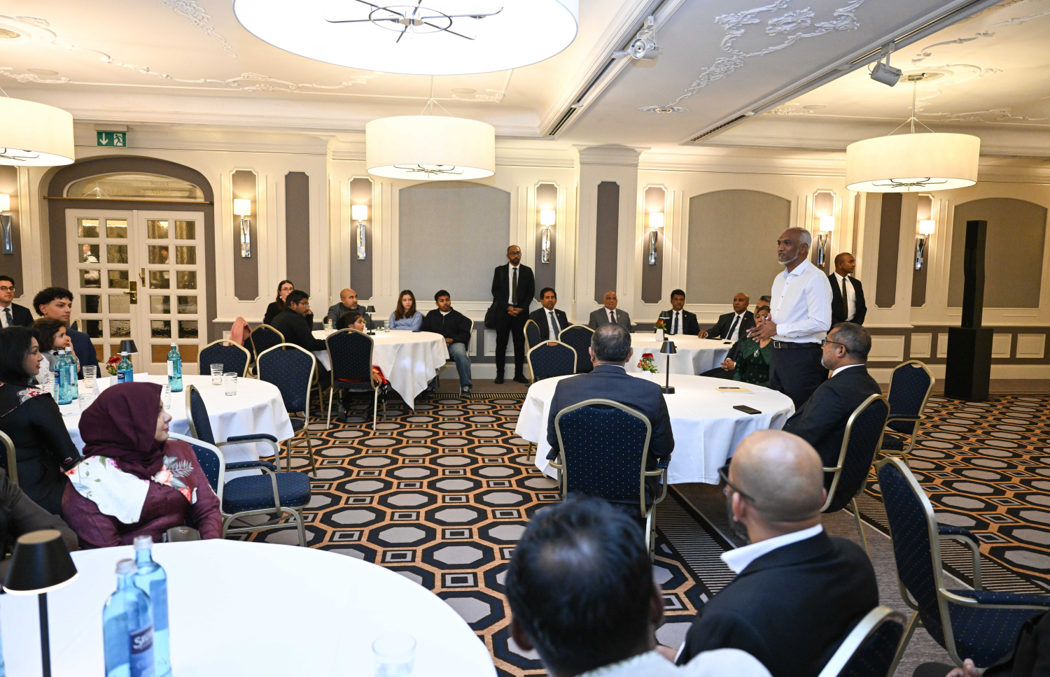 President Dr. Mohamed Muizzu delivers a speech at the event held to meet Maldivians residing in Germany during his visit to Germany --- Photo: President's Office