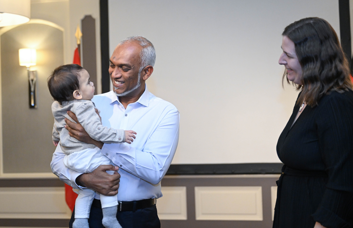 President Dr. Mohamed Muizzu holds a young child during the event held to meet Maldivians residing in Germany during his visit to Germany --- Photo: President's Office