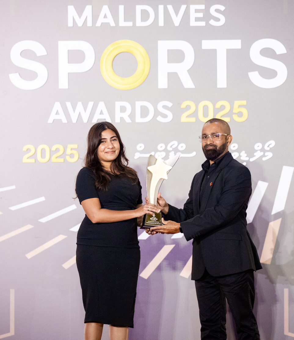 Nausham Waheed being presented with the Visual Artist of the Year 2025 award at the Maldives Sports Awards 2025 -- Photo: Nishan Ali | Mihaaru