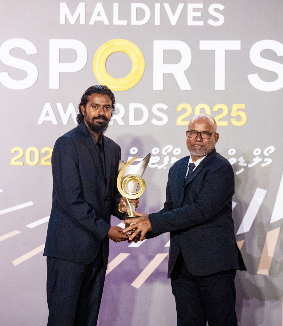 Moosa Munsif Ahmed being presented with the Sportsman of the Year 2025 award by President Dr. Mohamed Muizzu at the Maldives Sports Awards 2025 -- Photo: Nishan Ali | Mihaaru