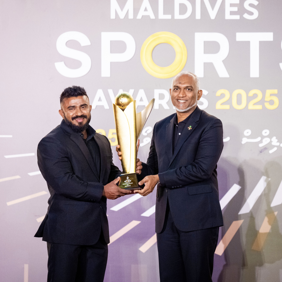 Azneen Rashad being presented with the Sportsman of the Year Gold Award (Non-Olympic Sports) by President Dr. Mohamed Muizzu at the Maldives Sports Awards 2025 -- Photo: Nishan Ali | Mihaaru