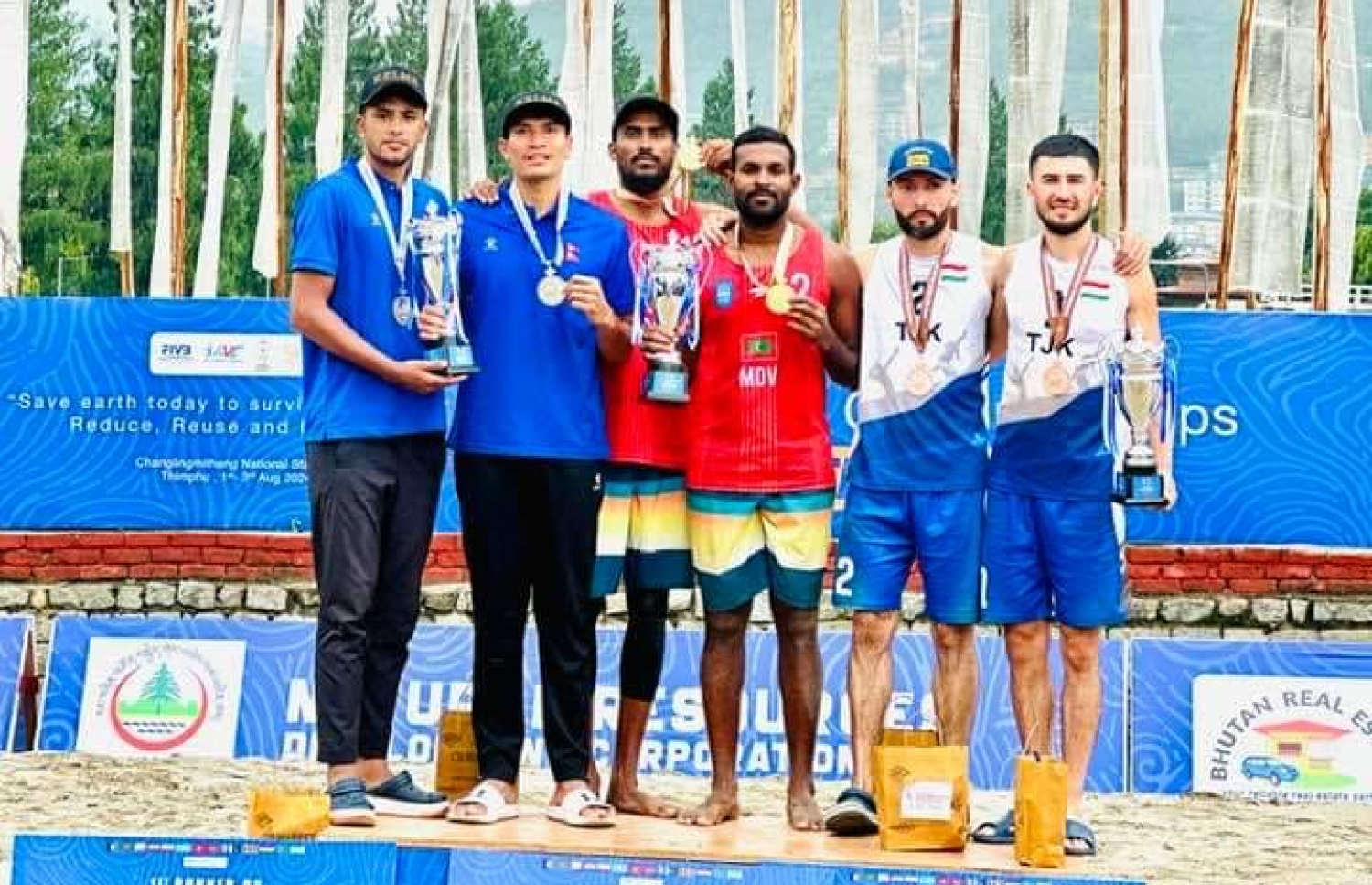 Adam and Saajidh's pair had triumphed the final match of this year's Men's CAVA Beach Volleyball Championships hosted by Bhutan, against Nepalese pair Man Bahadur Shrestha and Dil Bahadur Sunar in two straight sets with scores of 21-19 and 21-17.
