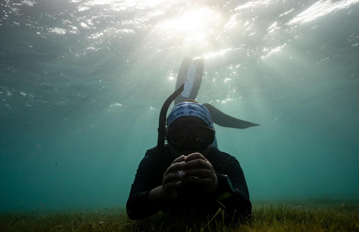 I started to swim. Having seen stingrays swimming in the silty lagoon from the shore, I was a little apprehensive - growing up we were told that the ocean was a dangerous place. After a few minutes I reached the dark patches I had spotted earlier. As I drew closer, I started to make out what was in front of me. It was a densely vegetated underwater meadow, a forest of long green grasses swaying back and forth in the water, dancing amongst the rays of sunlight. I was mesmerised.