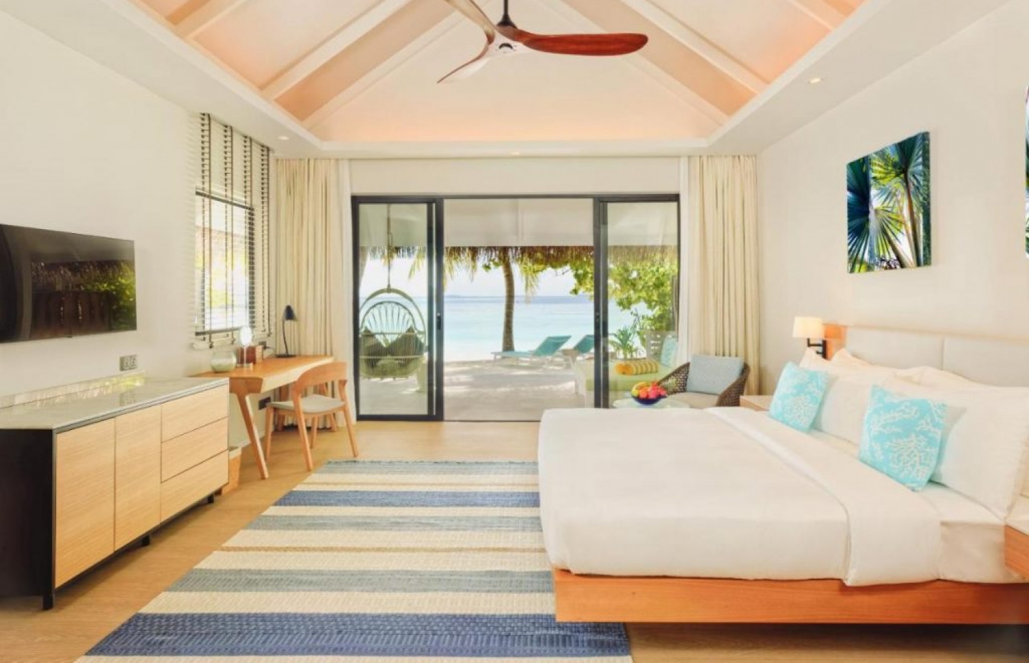 The resort has 76 ocean and land villas with individual terraces, seemingly infinite views of the Indian Ocean, breathtaking natural beauty; clad in tropical utopia. The spare and minimalist interiors provide a genuinely peaceful ambiance with their abundance of custom-made furniture, neutral whites, natural light, and warm textures.