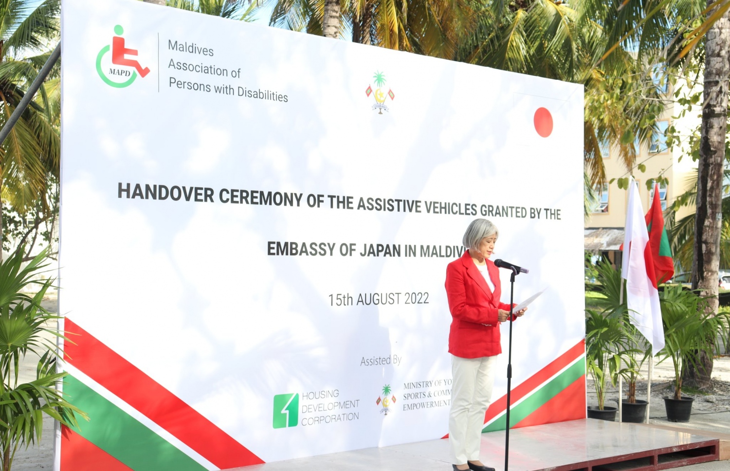 The Maldives Association of Persons with Disabilities (MAPD) has received three assistive vehicles, valued at USD 209,667 from H.E. Mrs. Takeuchi Midori, the Japanese Ambassador to the Maldives, as part of the Grant Assistance for Grassroots Human Security Project (GGP). The ceremony was held last Tuesday, 15th August, 2022.