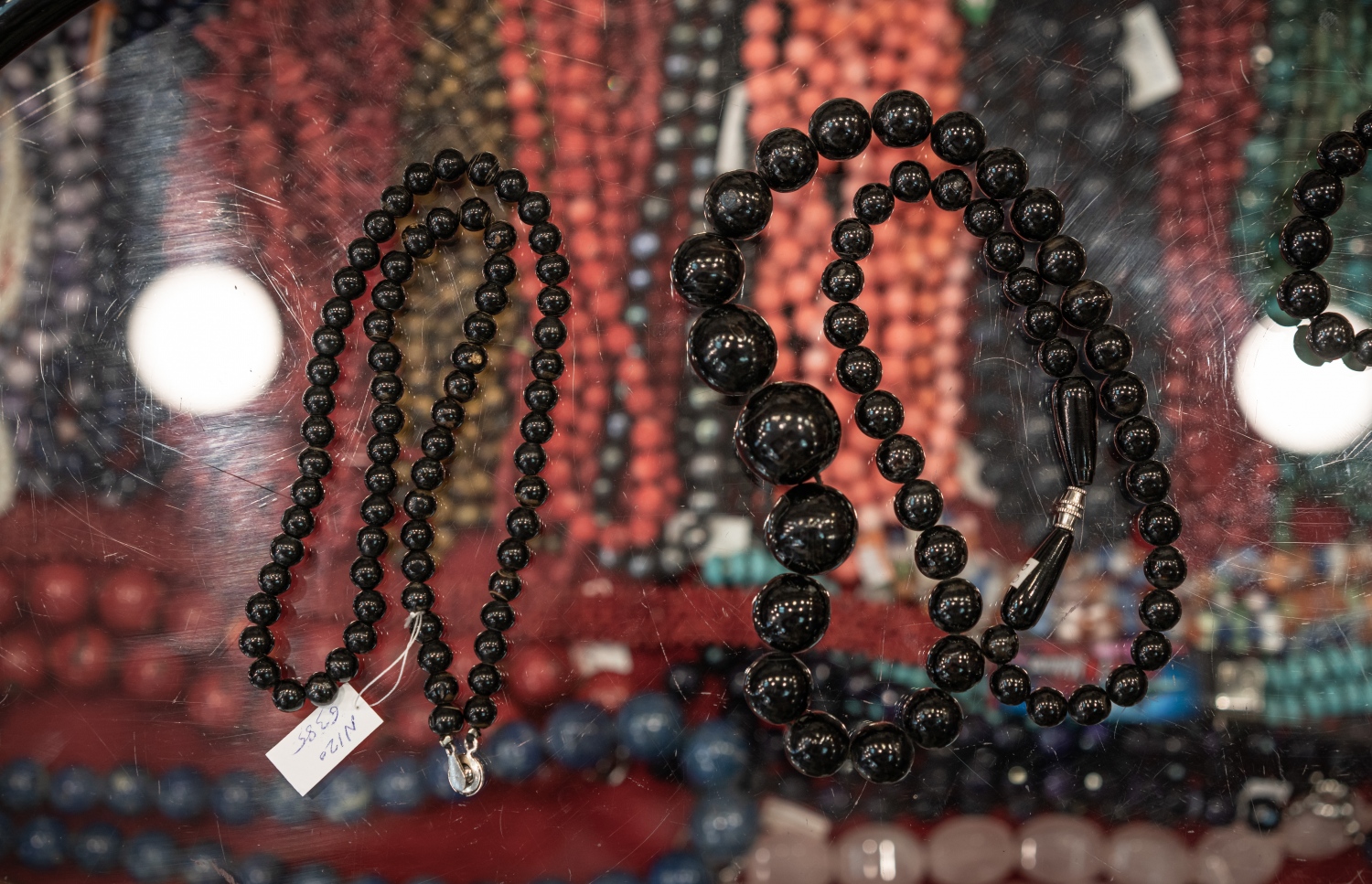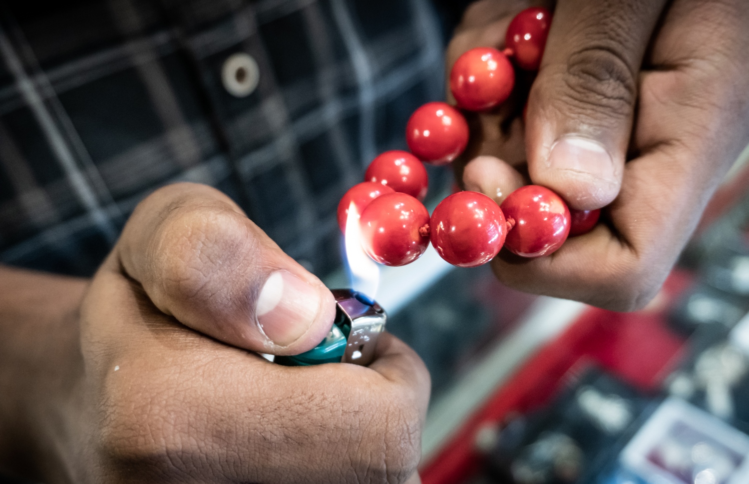 A shopkeeper burns a red coral necklace to prove its authenticity.