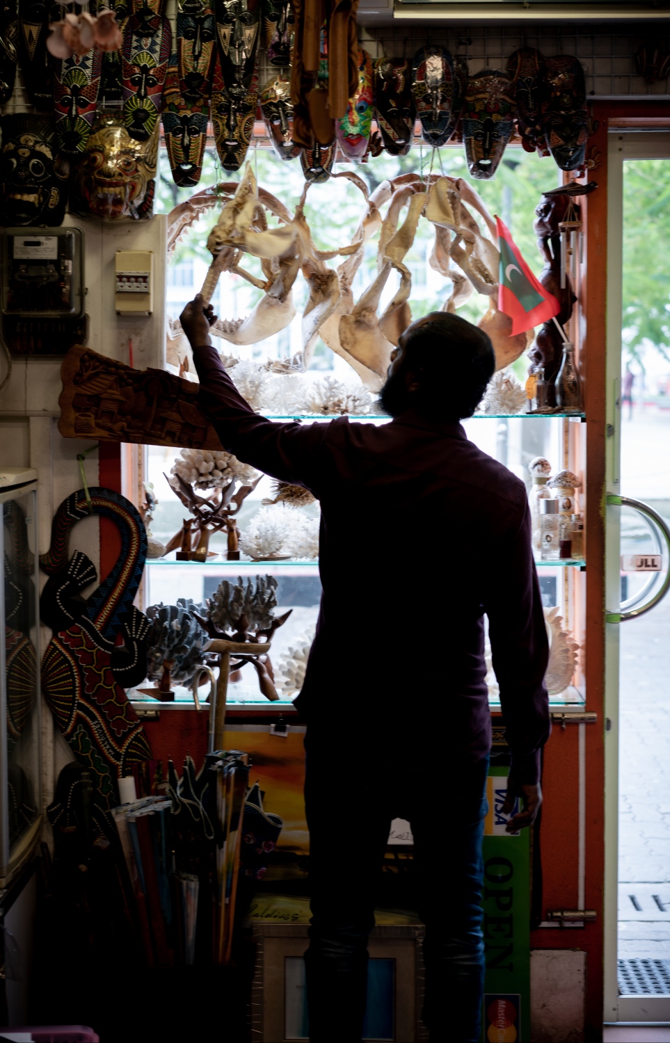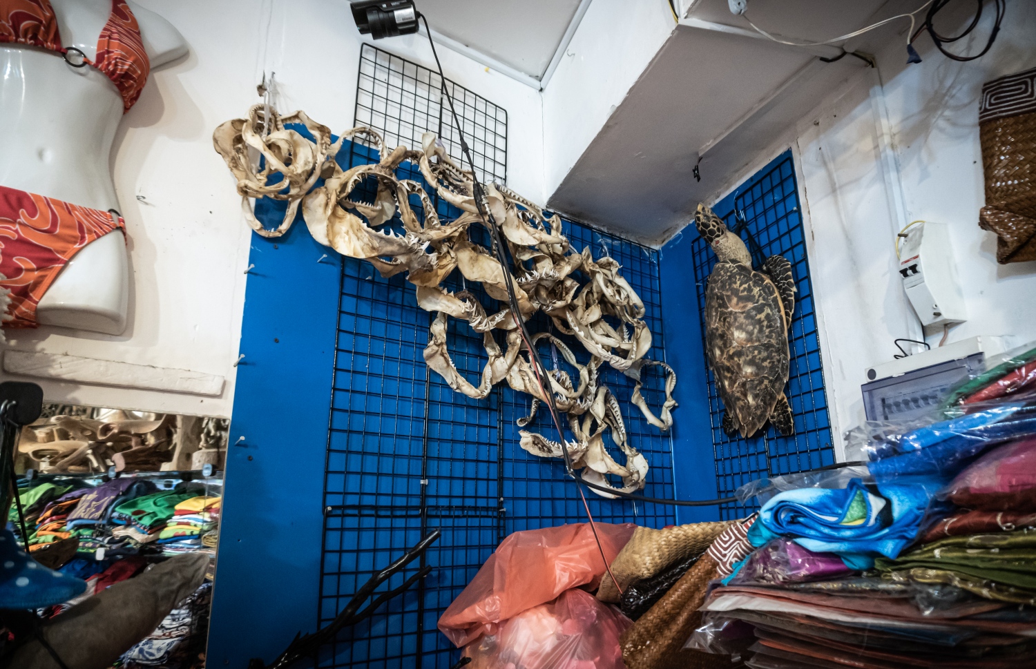 A shopkeeper looks over his collection of shark jaws, many of which were said to be from the Maldives. A lack of an import law in the Maldives, along with tiger and blue sharks not listed under CITES, allows many shopkeepers to claim that the jaws were imported. Illegal shark fishing observed by scuba divers is thought to strengthen claims that jaws and teeth on sale at tourist shops are from the Maldivian shark population.
