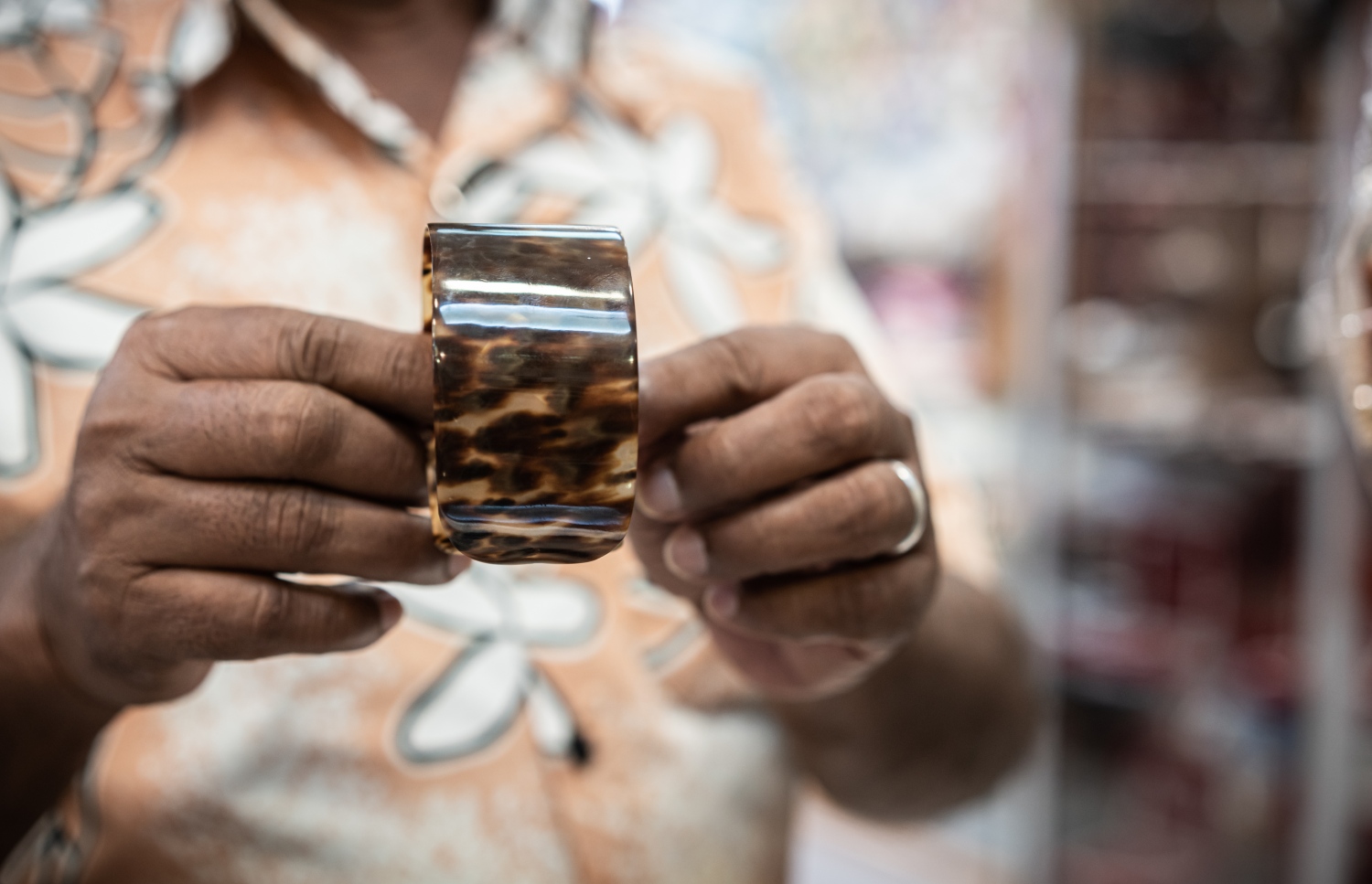 An example of a bracelet made from the shell of a hawksbill sea turtle. The shells are reportedly soaked in warm water, making them easy to mould into jewellery. Most of the shopkeepers said that their stocked turtles were taken from the Maldivian population.