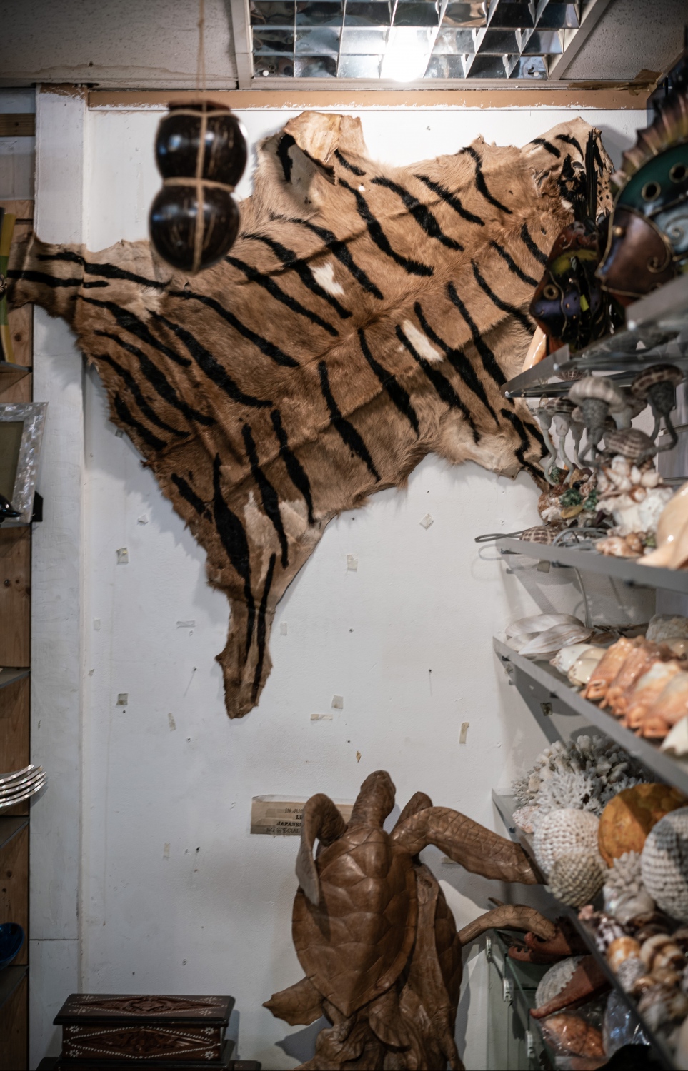 A range of shark jaws and a hawksbill sea turtle for sale. The vast majority of shark jaws and turtles can be seen by anyone who walks into a store.