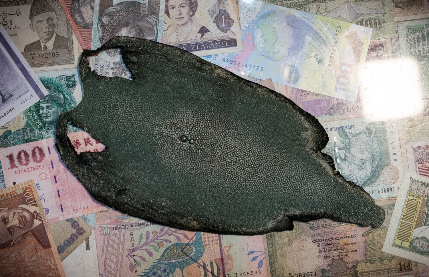 Stingray skin, or shagreen, in its raw form ready to be processed into an accessory such as a handbag. The capture, killing, injury to, and sale of all species of rays and skate (Batoidea) has been illegal in the Maldives since 2014. Whole stingrays or shagreen products are commonly for sale in the shops.