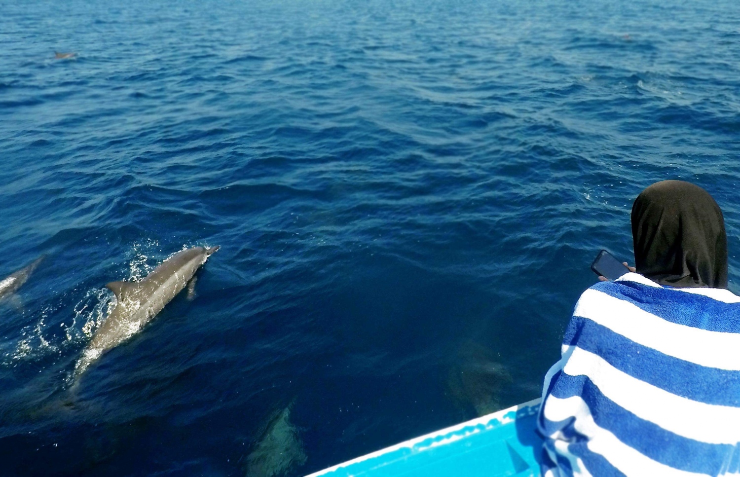 An hour into us being in the water, the boys in the boat were signalling us to come back. I was busy trying to warm myself with a towel when someone from the boat called out “dolphins”! I scrambled to the bow of the boat and I was greeted with the most spectacular sight. We were pleasantly ambushed by a pod of over 50 dolphins swimming and jumping around the boat, enthusiastically entertaining us before resuming their journey.
