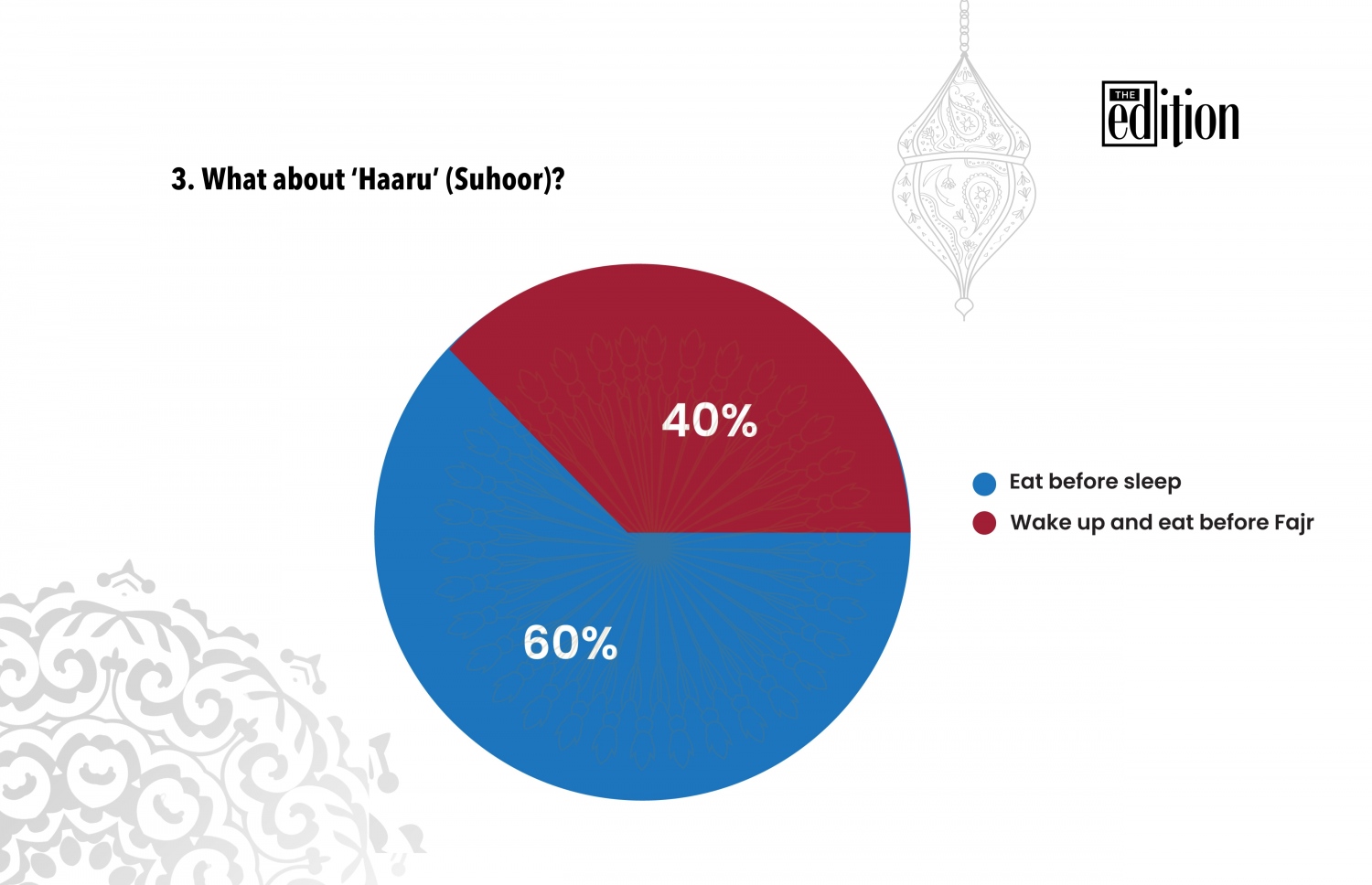 The collective results were not too far apart with only a 20 percent difference in their answers which had leaned towards the convenient practice of taking a meal before bed as opposed to the customary Ramadan routine of waking right before Fajr.