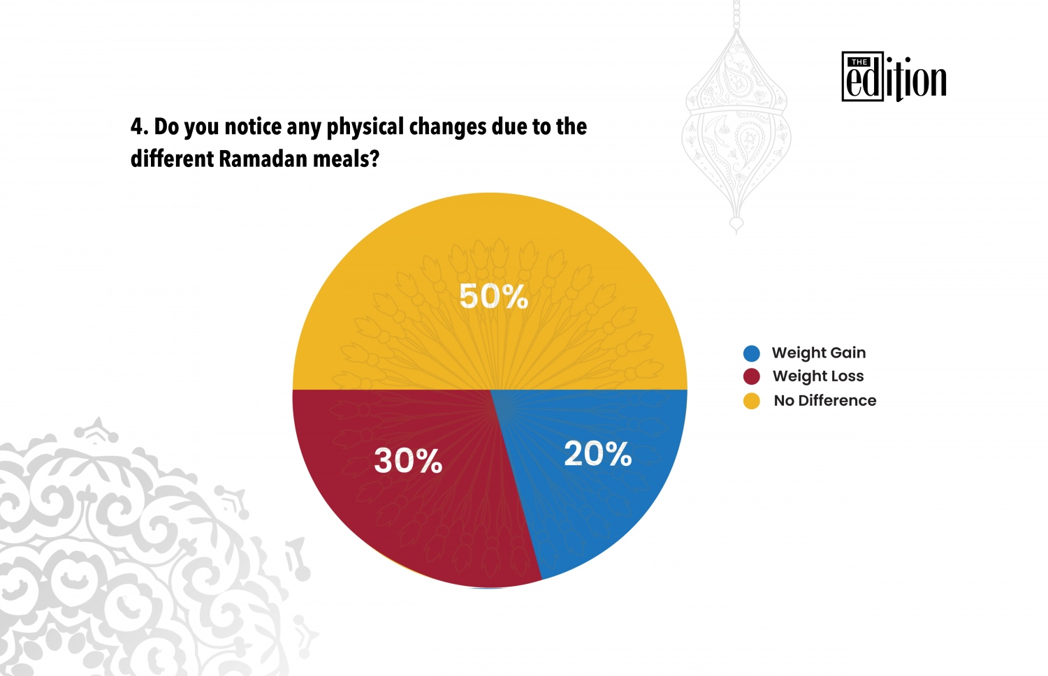Despite the common perception that Ramadan meals tend to drastically affect body weight, 50 percent of our interviewees had reported that no changes to their physique was noticed due to the various meals taken during this month. The remaining 50 percent was divided amongst both weight gain and weight loss with 30 percent noticing their body weight reducing in Ramadan.