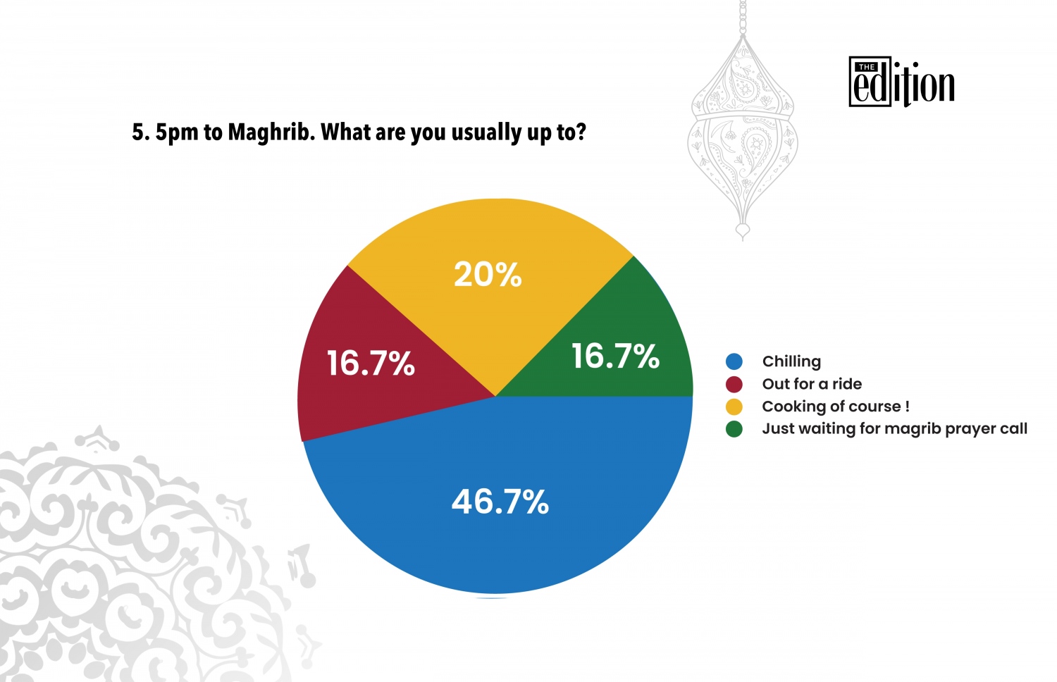 Understandably so, a striking 46.7% of interviewees reported that they simply unwind and lounge back during the time between 5PM and Maghrib prayer call. While the next most frequented routine amongst these interviewees was cooking during this time, this round up was data collected with 6 responses from 3 females and 3 males.