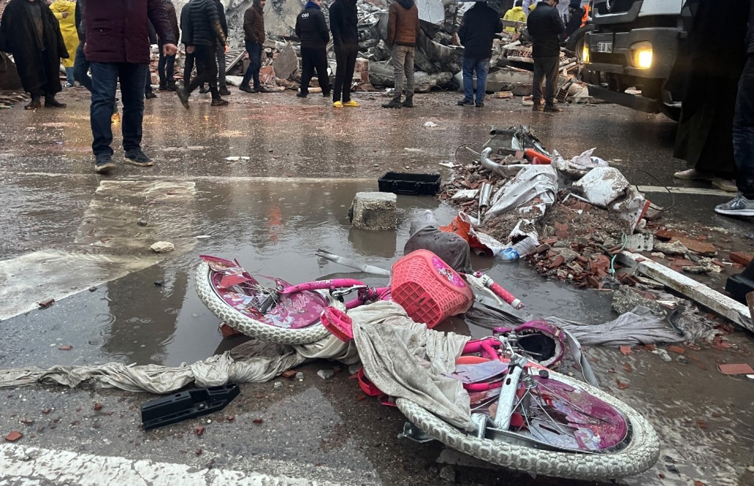 A photograph shows a dammaged bicycle as rescuers search for survivors through the rubble in Sanliurfa, on February 6, 2023, after a 7.8-magnitude earthquake struck the country's south-east. - At least 284 people died in Turkey and more than 2,300 people were injured in one of Turkey's biggest quakes in at least a century, as search and rescue work continue in several major cities. (Photo by AFP)