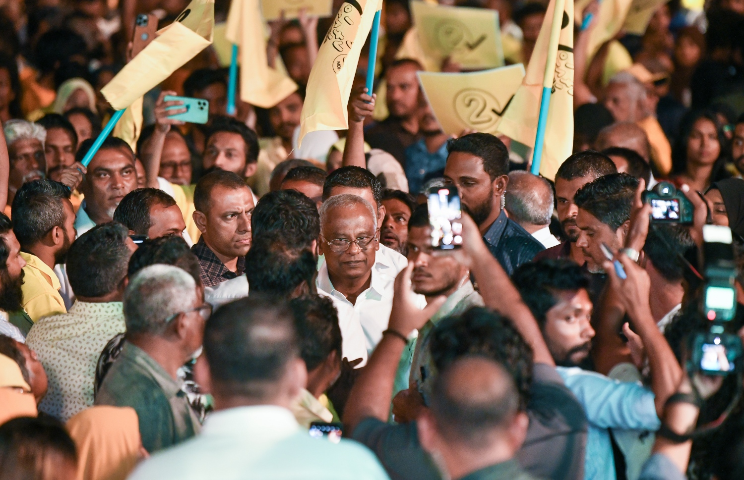 After his campaign tours in various islands of Maldives, the President held a rally at the Artificial Beach area of Malé. The area was crowded with Maldives Democratic Party (MDP) members.