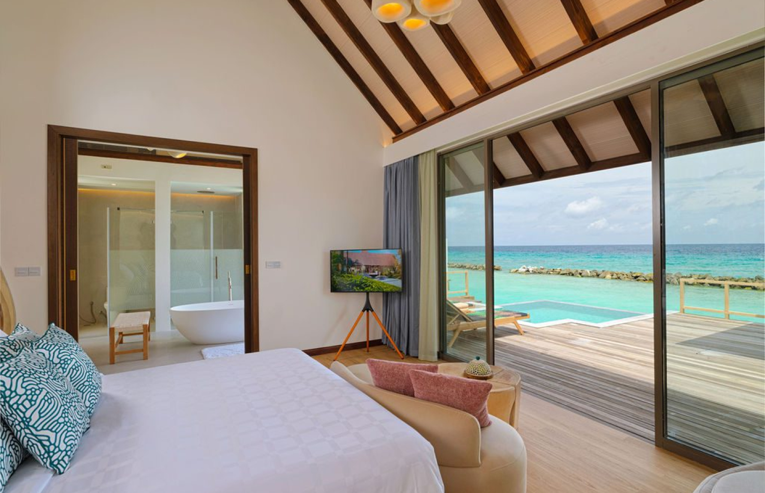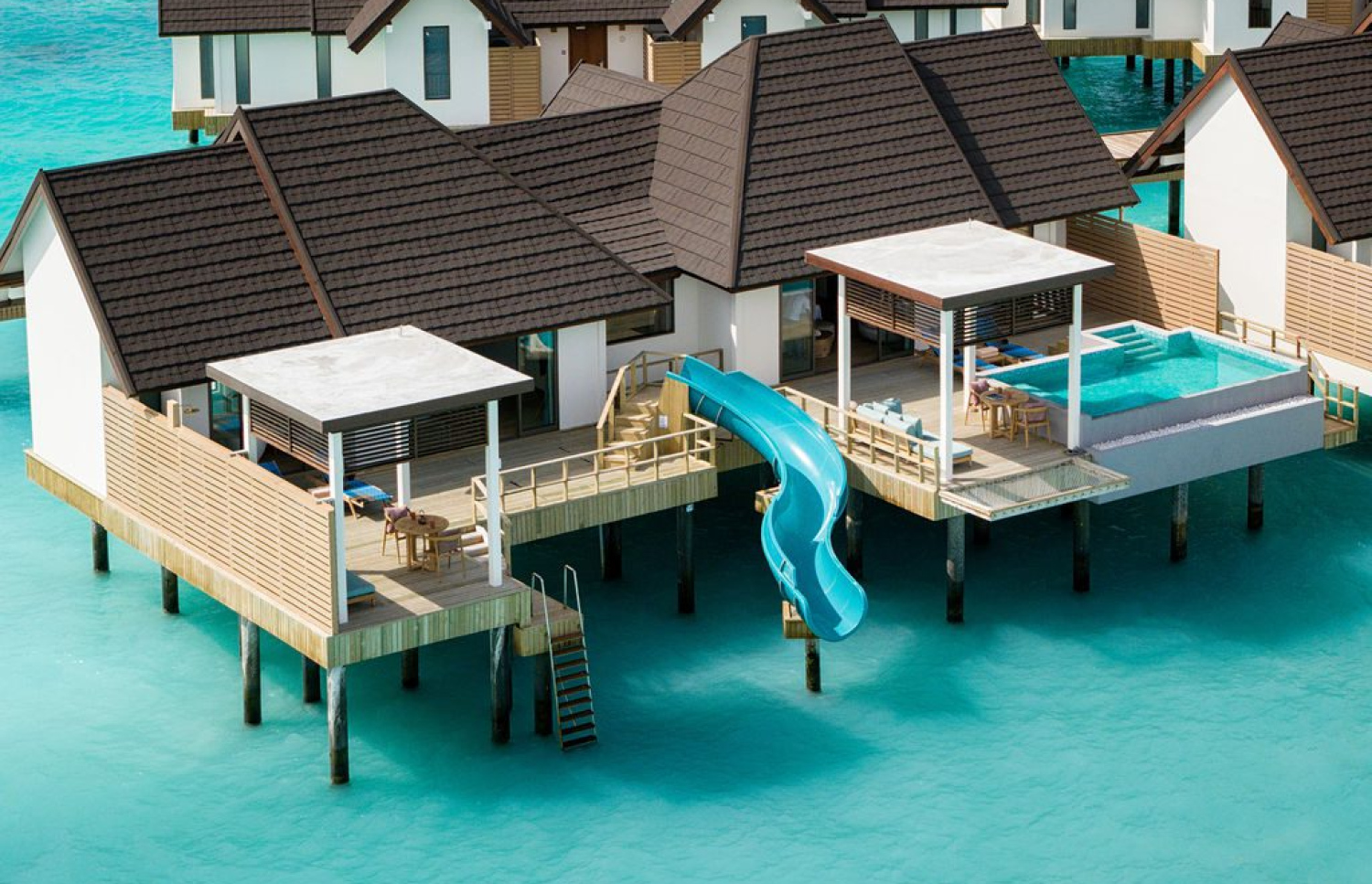 The eco-friendly, Maldivian-style resort has 94 luxury villas. Each villa has its own private pool. The resort also offers an underwater dining experience and an infinity pool.
