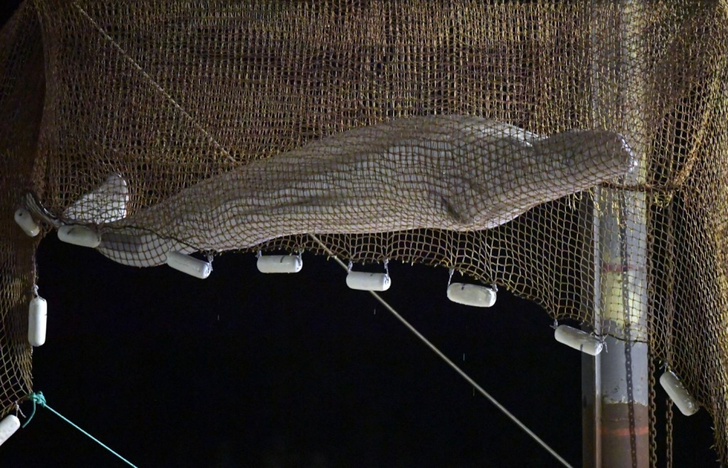 After nearly six hours of work by divers and rescuers, the 800-kilogram (1,800-pound) cetacean was lifted from the river by a net and crane at around 4:00 am (0200 GMT) and placed on a barge under the immediate care of a dozen veterinarians, AFP journalists said.