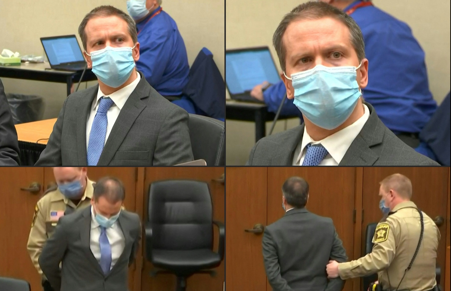 (COMBO) This combination of pictures created on April 20, 2021 shows former Minneapolis police officer Derek Chauvin listening to the verdict and being taken away handcuffed in his trial for the killing of George Floyd, in Minneapolis, Minnesota, on April 20, 2021. - Derek Chauvin, a white former Minneapolis police officer, was convicted on April 20 of murdering African-American George Floyd after a racially charged trial that was seen as a pivotal test of police accountability in the United States. (Photos by - / various sources / AFP) / RESTRICTED TO EDITORIAL USE - MANDATORY CREDIT "AFP PHOTO / COURT TV" - NO MARKETING - NO ADVERTISING CAMPAIGNS - DISTRIBUTED AS A SERVICE TO CLIENTS