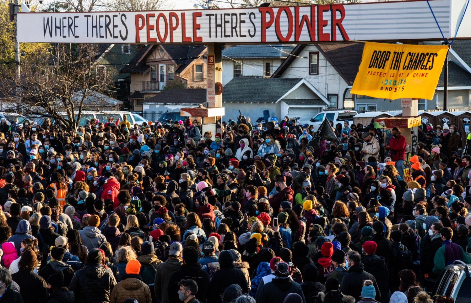 People gather as they celebrate at George Floyd Square after the verdict was announced in the trial of former police officer Derek Chauvin in Minneapolis, Minnesota on April 20, 2021. Derek Chauvin, a white former Minneapolis police officer, was convicted on April 20 of murdering African-American George Floyd after a racially charged trial seen as a pivotal test of police accountability in the United States.